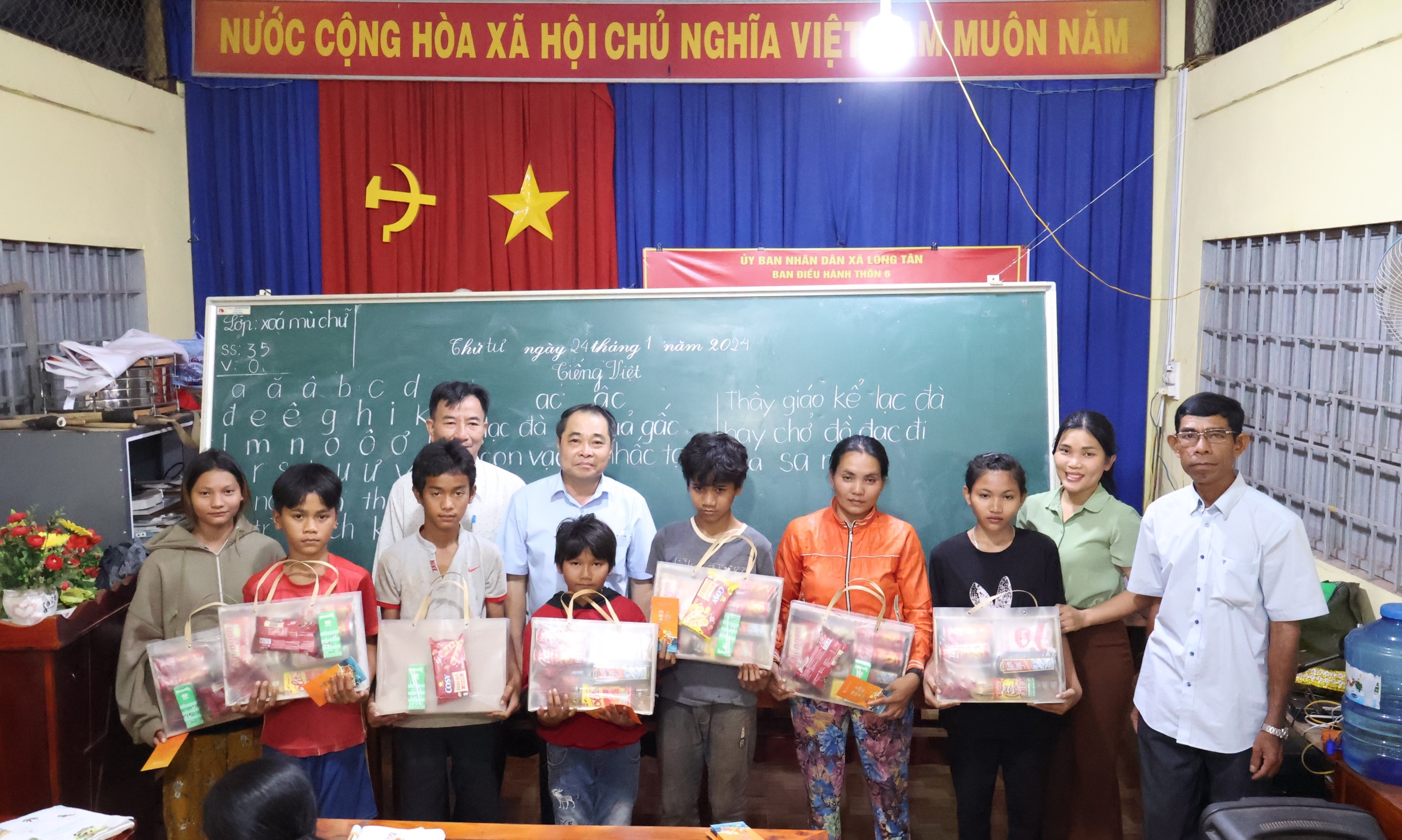 Tối 24-1, Phó Chủ tịch UBND huyện Bùi Văn Hiếu cùng các phòng, ban huyện, xã Long Tân đã đến động viên, tặng quà tết cho lớp xóa mù chữ, thôn 6, xã Long Tân. Thôn 6, xã Long Tân có 80% là đồng bào dân tộc thiểu số, vì điều khiện khó khăn nên trong thôn còn khá đông người dân chưa biết chữ. Tháng 7- 2023, Tại thôn đã khai giảng lớp phổ cập giáo dục- xóa mù chữ, lớp có 35 học viên đang theo học, độ tuổi từ 10 đến 66 tuổi, chủ yếu là đồng bào dân tộc thiểu số. Với sự tận tụy, kiên trì của các giáo viên, đến nay học viên cơ bản đã biết đọc, biết viết. Đến thăm, lãnh đạo huyện Phú Riềng đã động viên các học viên và trao tặng 38 phần quà tết cho học viên và các cô giáo. Mỗi phần quà trị giá 500 ngàn, gồm tiền mặt và nhu yếu phẩm trong ngày tết.
