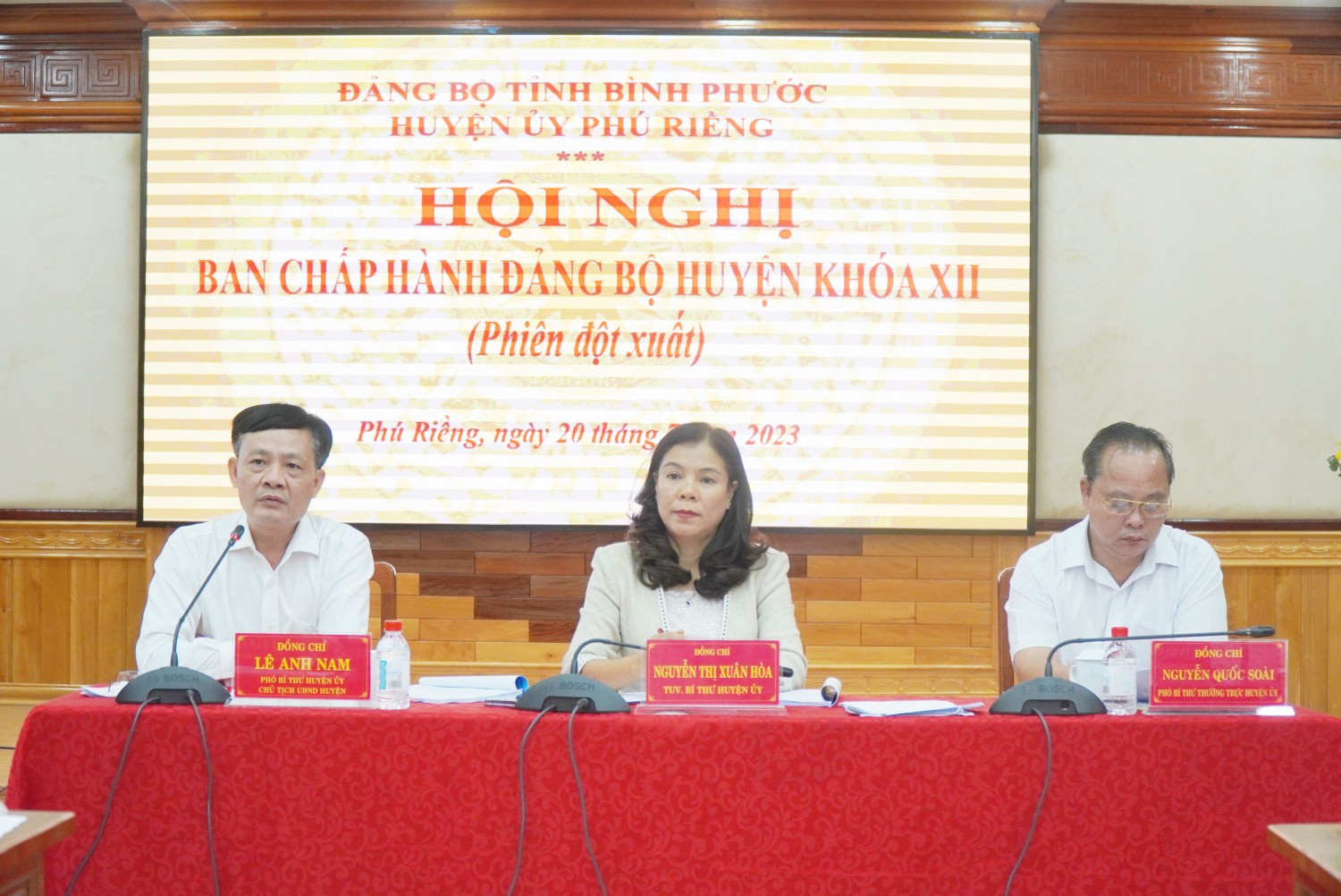 Ngày 20-7, Huyện ủy Phú Riềng tổ chức hội nghị Ban Chấp hành Đảng bộ huyện khóa XII (phiên đột xuất). Tỉnh ủy viên, Bí thư Huyện ủy Nguyễn Thị Xuân Hòa; Phó Bí thư Thường trực Huyện ủy, Chủ tịch HĐND huyện Nguyễn Quốc Soài và Phó Bí thư Huyện ủy, Chủ tịch UBND huyện Lê Anh Nam đồng chủ trì hội nghị.