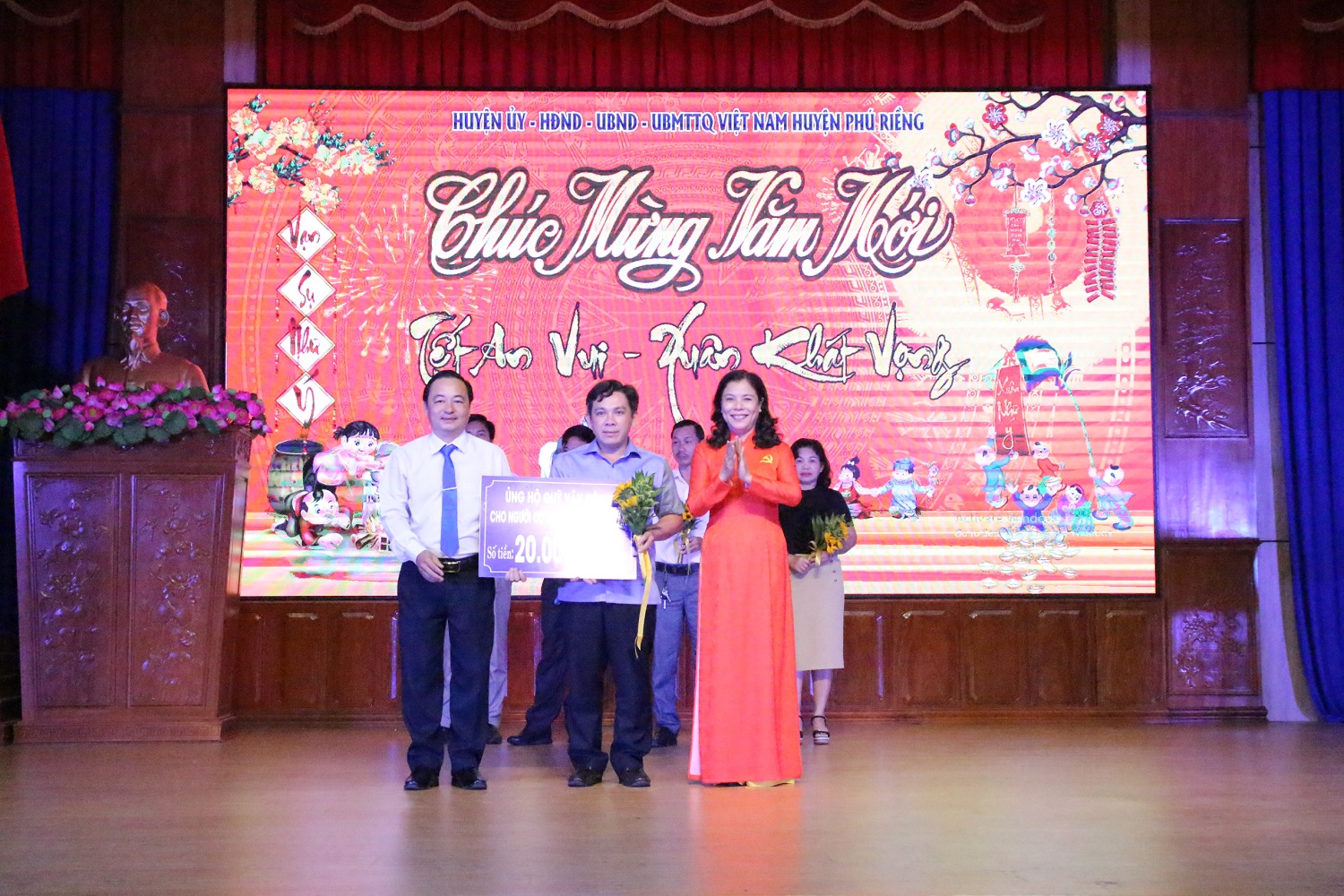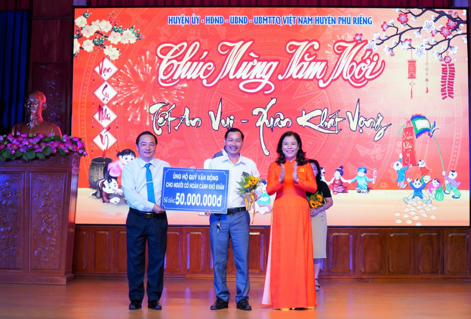 Chiều 5-1, Huyện ủy- HĐND- UBND- UB MTTQ VN huyện Phú Riềng tổ chức Chương trình Mừng Đảng, mừng xuân, gặp mặt doanh nghiệp và phát động ủng hộ “Tết vì người nghèo”. TUV, Bí thư Huyện ủy Nguyễn Thị Xuân Hòa; Phó Bí thư Thường trực huyện ủy, Chủ tịch HĐND huyện Nguyễn Quốc Soài, Phó Bí thư, Chủ tịch UBND huyện Lê Anh Nam; Trưởng Ban Dân vận, Chủ tịch UB MTTQ VN Phạm Hồng Công cùng các đồng chí trong Ban Chấp hành, Ban thường vụ huyện ủy, lãnh đạo các phòng, ban, đơn vị, 10 xã, Bí thư Chi bộ các thôn, các Đảng viên huy hiệu Đảng; đại diện các công ty, doanh nghiệp, hợp tác xã và đông đảo khách mời tiêu biểu cùng dự. Trong không khí vui tươi, phấn khởi của những ngày đầu năm mới, các Đại biểu đã cùng nhau thưởng thức các tiết mục văn nghệ, xem phim tư liệu và phóng sự khái quát năm 2023 của huyện Phú Riềng; ôn lại truyền thống 93 năm ngày thành lập Đảng Cộng sản Việt Nam, nghe báo cáo nhanh tình hình phát triển KT-XH, QP-AN của địa phương trong năm qua.... Nhân dịp tết đến, xuân về, với tinh thần “Tương thân tương ái” và mục tiêu của huyện Phú Riềng là “Người người có tết, nhà nhà đón tết”, tại Chương trình, Trưởng Ban Dân vận, Chủ tịch UB MTTQ VN Phạm Hồng Công đã phát động ủng hộ “Tết vì người nghèo”, qua đó đã nhận được rất nhiều tình cảm của các tổ chưc, cá nhân, công ty, doanh nghiệp trong và ngoài huyện. Tổng hợp nhanh tại Chương trình, đã có hàng chục đơn vị chung tay cùng huyện Phú Riềng chăm lo tết cho người nghèo với số tiền trên 1,5 tỷ đồng. Chương trình "Tết vì người nghèo" được huyện Phú Riềng tổ chức hằng năm mang nhiều ý nghĩa nhân văn, thể hiện tinh thần "tương thân tương ái", toàn xã hội quan tâm chăm lo cho người nghèo, không để ai bị bỏ lại phía sau. Huyện Phú Riềng sẽ sử dụng hiệu quả nguồn ủng hộ "Tết vì người nghèo" để hỗ trợ các hộ nghèo, hộ mới thoát nghèo, giúp nhân dân có cái Tết ấm no, hạnh phúc, đủ đầy hơn. Trưởng Ban Dân vận, Chu tịch UB MTTQ VN huyện Phú Riềng Phạm Hồng Công phát động ủng hộ Tết vì người nghèo.