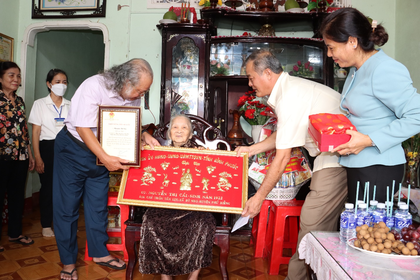 Chiều 28-9, Ủy viên Ban thường vụ, Trưởng ban Tổ chức Tỉnh ủy Nguyễn Hồng Trà cùng đoàn công tác của tỉnh đến thăm, tặng quà cho người cao tuổi trên địa huyện Phú Riềng. Tỉnh ủy viên, Bí thư Huyện ủy Nguyễn Thị Xuân Hòa và đại diện lãnh đạo UBND huyện cùng tham gia đoàn. Đoàn đã đến thăm, tặng quà và chúc sức khỏe các cụ tròn 100 tuổi, gồm: Cụ Nguyễn Thị Đáp, thôn Phước Thịnh, xã Bình Tân; cụ Đinh Thị Thuẫn, thôn 5, xã Long Hưng; cụ Bùi Ngọc Ban ở thôn Tân Hiệp 2, cụ Nguyễn Thị Cái ở thôn Tân Lực xã Bù Nho và cụ Võ Thị Tẩu ở thôn Phú Lợi, xã Phú Riềng. Tại các nơi đến thăm Ủy viên Ban thường vụ, Trưởng ban Tổ chức Tỉnh ủy Nguyễn Hồng Trà và đoàn công tác đã ân cần hỏi thăm sức khỏe, đời sống sinh hoạt của các cụ, chúc các cụ dồi dào sức khỏe, là cây cao bóng cả, chỗ dựa tinh thần cho con cháu. Đồng thời, động viên con cháu nỗ lực hơn nữa học tập, lao động phát triển kinh tế gia đình, tạo nền tảng gia đình hạnh phúc; tích cực tham gia các phong trào hoạt động ở địa phương góp phần vào sự phát triển chung của tỉnh. Trưởng ban Tổ chức Tỉnh ủy Nguyễn Hồng Trà khẳng định người cao tuổi là vốn quý của dân tộc, đề nghị chính quyền địa phương và gia đình, dòng họ: Tăng cường quan tâm, chăm sóc để người cao tuổi có đời sống ổn định về vật chất và tinh thần. Dịp này, Trưởng ban Tổ chức Tỉnh ủy Nguyễn Hồng Trà và Bí thư Huyện ủy Nguyễn Thị Xuân Hòa đã trao khánh, mừng thọ của Chủ nước Nguyễn Xuân Phúc và tặng quà chúc mừng của Tỉnh ủy, HĐND, UBND và UBMTTQVN tỉnh cho các cụ. Cá nhân hai đồng chí cũng có những món quà riêng tặng các cụ cao tuổi. Cùng ngày 28/9, Thượng tá Võ Văn Nhân- UV BTV Huyện ủy, Chỉ huy trưởng Ban chỉ huy quân sự huyện Phú Riềng đã đi thăm, tặng quà các cụ cao tuổi trên địa bàn xã Long Bình. Đoàn đã đến thăm các cụ tròn 90 tuổi gồm: cụ Lê Thị Chang, thôn 1, cụ Trịnh Đức Uyên, thôn 2; cụ Nghiêm Chí Cáng và cụ Nguyễn Thị kim Liên đều ngụ thôn 5.