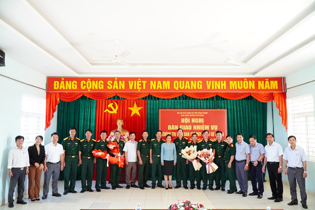 Sáng nay 25-11, Ban CHQS huyện tổ chức Hội nghị bàn giao chức danh Chính trị viên Ban CHQS huyện. Đại tá Phạm Như Quân, TUV, Phó Bí thư Thường trực Đảng ủy Quân sự tỉnh, Chính ủy Bộ CHQS tỉnh và đồng chí Nguyễn Thị Xuân Hòa, TUV, Bí thư Huyện ủy, Bí thư Đảng ủy Quân sự huyện về dự. Ban CHQS huyện đã tiến hành bàn giao chức trách, nhiệm vụ, chức danh kiêm nhiệm của Chính trị viên, công văn, tài liệu, cơ sở vật chất, vũ khí, trang bị kỹ thuật và nhiệm vụ công tác quốc phòng, quân sự địa phương giữa Thượng tá Đoàn Ngọc Bảy – người bàn giao và Trung tá Trần Thanh Lâm – người nhận bàn giao. Phát biểu tại hội nghị, đồng chí Nguyễn Thị Xuân Hòa, Bí thư Huyện ủy, Bí thư Đảng ủy Quân sự huyện chúc mừng Thượng tá Đoàn Ngọc Bảy và Trung tá Trần Thanh Lâm. Đồng chí trân trọng, ghi nhận và đánh giá cao những cống hiến, đóng góp của đồng chí Bảy trong công tác xây dựng Đảng bộ, công tác quân sự - quốc phòng của huyện trong thời gian qua; chúc đồng chí Bảy hoàn thành xuất sắc nhiệm vụ mới. Đồng chí đề nghị trên cương vị công tác mới, Trung tá Trần Thanh Lâm cần nhanh chóng nắm bắt công việc, phát huy hết tinh thần trách nhiệm, nỗ lực phấn đấu để hoàn thành tốt nhiệm vụ được giao, góp phần xây dựng lực lượng vũ trang huyện Phú Riềng ngày càng vững mạnh, toàn diện. Phát biểu tại buổi bàn giao, Đại tá Phạm Như Quân, Phó Bí thư Thường trực Đảng ủy Quân sự tỉnh, Chính ủy Bộ CHQS tỉnh ghi nhận, đánh giá cao những đóng góp của Thượng tá Đoàn Ngọc Bảy trong công tác lãnh đạo, chỉ đạo lực lượng vũ trang huyện Phú Riềng thực hiện thắng lợi nhiệm vụ quốc phòng, quân sự địa phương. Đại tá Phạm Như Quân khẳng định, trải qua nhiều vị trí công tác Thượng tá Đoàn Ngọc Bảy có bề dày kinh nghiệm và tâm huyết trong công tác. Đại tá Phạm Như Quân đề nghị với cương vị mới, Trung tá Trần Thanh Lâm nhanh chóng nắm bắt công việc mới, nêu cao vai trò trách nhiệm, xây dựng đoàn kết nội bộ, phát huy quy chế tập trung dân chủ. Đồng thời, phối hợp kết hợp với đồng chí Chỉ huy trưởng, tham mưu cấp uỷ, chính quyền địa phương xây dựng đơn vị vững mạnh toàn diện, thực hiện thắng lợi nhiệm vụ quốc phòng - quân sự địa phương, hoàn thành xuất sắc chức trách, nhiệm vụ được giao. Trước đó, Đảng ủy, Bộ CHQS tỉnh đã công bố quyết định bổ nhiệm của Quân khu 7, bổ nhiệm Thượng tá Đoàn Ngọc Bảy, Chính trị viên Ban CHQS huyện Phú Riềng giữ chức Trưởng ban Khoa học quân sự, Bộ CHQS tỉnh Bình Phước. Bổ nhiệm chức vụ có thời hạn đối với Trung tá Trần Thanh Lâm, Chính trị viên phó kiêm Trưởng ban Chính trị, Ban CHQS huyện Phú Riềng giữ chức Chính trị viên Ban CHQS huyện Phú Riềng. Dịp này, lãnh đạo Bộ CHQS tỉnh và lãnh đạo huyện Phú Riềng cũng tặng hoa chúc mừng 2 đồng chí được bổ nhiệm Thiếu tá Vũ Văn Thọ, Phó Chỉ huy trưởng và Thiếu tá Nguyễn Trọng Tình, Chính trị viên phó, Ban CHQS huyện Phú Riềng. Đại tá Phạm Như Quân, TUV, Phó Bí thư Thường trực Đảng ủy Quân sự tỉnh, Chính ủy Bộ CHQS tỉnh và đồng chí Nguyễn Thị Xuân Hòa, TUV, Bí thư Huyện ủy, Bí thư Đảng ủy Quân sự huyện tặng hoa chúc mừng các đồng chí được bổ nhiệm Các đại biểu chụp hình lưu niệm