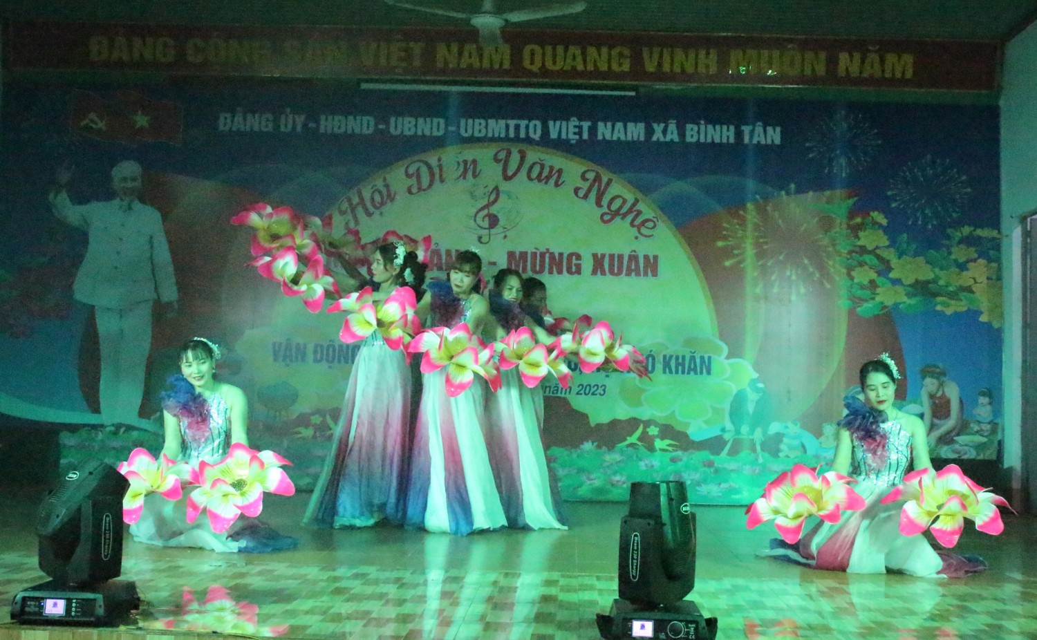 Tối 10-1, Đảng ủy- HĐND-UBND-UB MTTQ VN xã Bình Tân tổ chức Hội diễn văn nghệ Mừng đảng- Mừng xuân Quý Mão 2023, vận động quà tết cho hộ nghèo, hộ khó khăn trên địa bàn xã. HUV-Bí thư Đảng ủy xã Nguyễn Hoàng Anh cùng lãnh đạo HĐND- UBND- UB MTTQ VN, các Ban, ngành, đoàn thể xã, ban thôn và đông đảo bà con nhân dân cùng dự. Hội diễn lần này, có 7 đội tham gia, đến từ 7 thôn trên địa bàn xã với 158 diễn viên không chuyên, gồm nhiều tiết mục đơn ca, tốp ca, múa. Nội dung ca ngợi Đảng, ca ngợi Bác Hồ, tình yêu quê hương, đất nước, con người Bình Phước... Các tiết mục được dàn dựng công phu, trang phục đẹp....đã làm không khí Hội diễn trở nên sôi nổi, thu hút đông đảo bà con nhân dân đến xem và cổ vũ. Nhằm chung tay chăm lo cho các hộ dân có hoàn cảnh khó khăn được đón tết đầm ấm, trọn vẹn. Tại Hội diễn, xã Bình Tân đã phát đông vận động quà tết cho người nghèo và nhận được sự ủng hộ của các tổ chức, cá nhân, công ty doanh nghiệp trong và ngoài xã. Tại chương trình, các mạnh thường quân đã ủng hộ số tiền trên 62 triệu đồng, đồng thời trực tiếp trao một số phần quà tết cho bà con có hoàn cảnh khó khăn trên địa bàn có điều kiện vui Xuân, đón Tết đầm ấm hơn./. Ban tổ chức tặng cơ lưu niệm cho các đơn vị tham gia Hội diễn Văn nghệ mừng đảng mừng xuân xã Bình Tân. Các nghệ sĩ không chuyên đã mang đến Chương trình nhiều tiết mục văn nghệ vui tươi, đặc sắc.