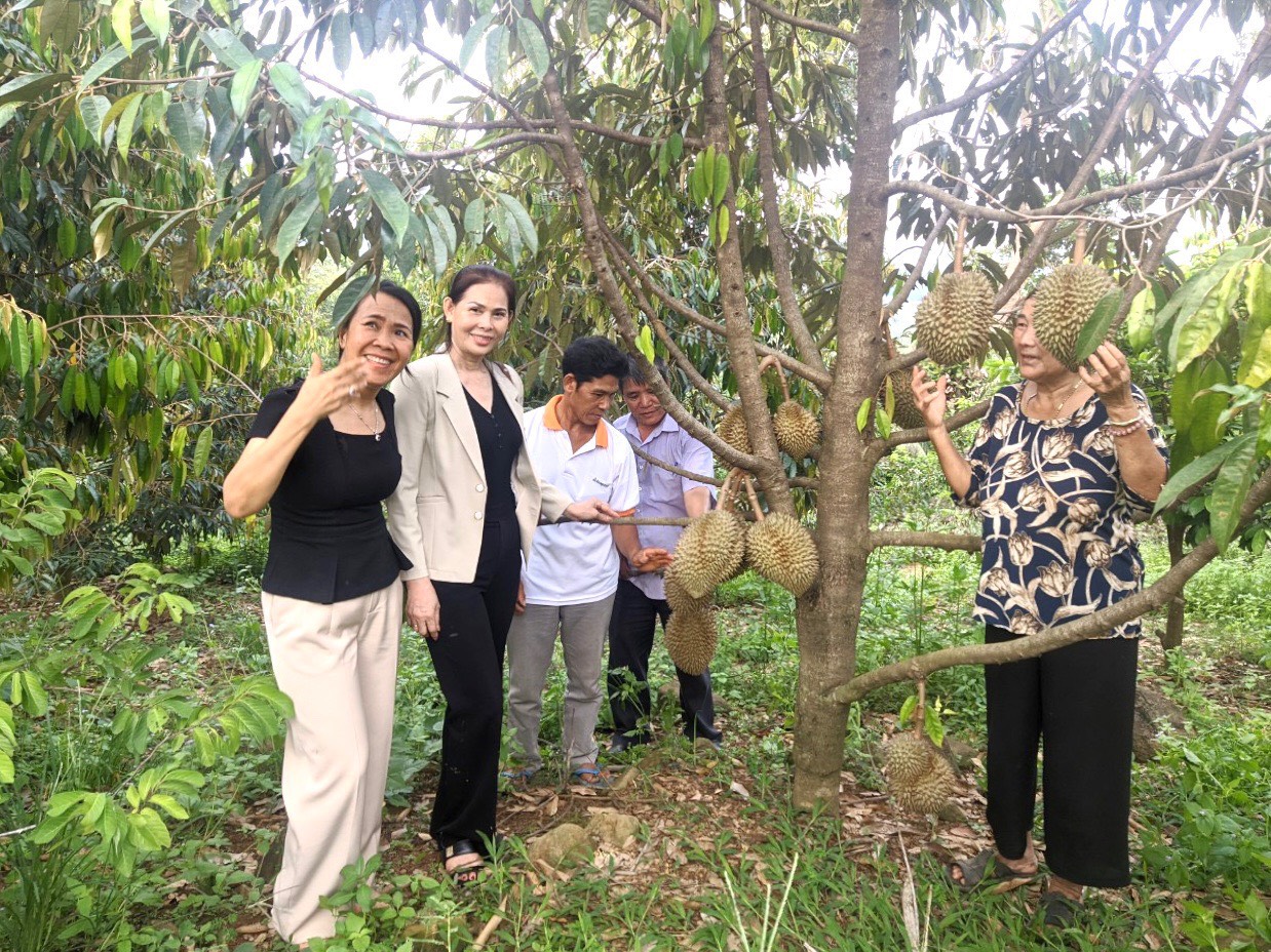 Chủ tịch Hội Nông dân huyện Nguyễn Thị Hương đi thăm các hộ trồng dưa lưới tại xã Phú Riềng và Hợp tác xã Thành Lợi