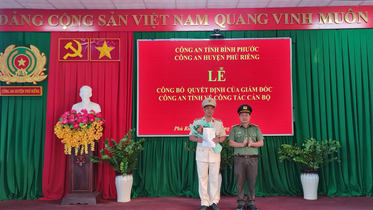 Ngày 20-7, Công an huyện Phú Riềng tổ chức Lễ Công bố quyết định của Giám đốc Công an tỉnh Bình Phước về công tác cán bộ. Thượng tá Phan Văn Dần-UVBTV, Trưởng Công an huyện cùng các Phó Trưởng công an huyện dự Lễ. Tại trụ sở Công an huyện, thừa ủy quyền của giám đốc Công an tỉnh Bình Phước, Công an huyện Phú Riềng đã công bố các quyết định: điều động, bổ nhiệm thiếu tá Trần Văn Mức- Phó trưởng Đội Cảnh sát Giao thông Đường bộ số 2, Phòng PC08, đến nhận công tác và giữ chức vụ Đội trưởng Đội Cảnh sát Giao thông Công an huyện Phú Riềng; điều động Trung tá Nguyễn Thanh Long- Đội trưởng Đội Cảnh sát Điều tra Tội phạm về Trật tự xã hội đến nhận công tác và giữ chức vụ Đội trưởng Đội Cảnh sát Điều tra Tội phạm về Ma túy và giao đồng chí Đại úy Phạm Văn Vương- Phó Đội trưởng, Phụ trách Đội Cảnh sát Điều tra về Trật tự Xã hội. Tại xã Bình Tân, Công an huyện Phú Riềng đã công bố quyết định điều động Thiếu tá Hà Văn Kiên- Đội phó Đội Tham mưu Tổng hợp về nhận nhiệm vụ Phó Trưởng Công an xã Bình Tân. Phát biểu nhận nhiệm vụ, các đồng chí được nhận quyết định đã cảm ơn sự quan tâm, tin tưởng của lãnh đạo các cấp, đồng thời hạ quyết tâm trên cương vị mới sẽ phấn đấu, nỗ lực nhiều hơn nữa, phối hợp tốt với tập thể, hoàn thành mọi nhiệm vụ được giao. Lãnh đạo Công an huyện Phú Riềng trao quyết định cho các cá nhân. Lãnh đạo Công an huyện Phú Riềng, xã Bình Tân trao quyết định và tặng hoa chúc mừng thiếu tá Hà Văn Kiên, Phó Trưởng Công an xã Bình Tân.