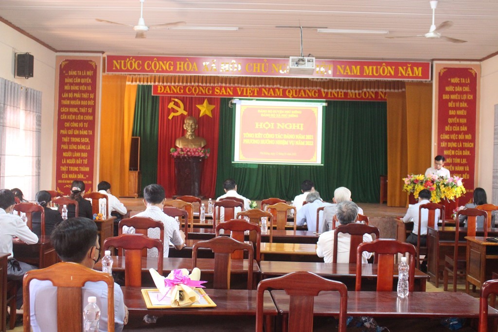 Ngày 12-1, Đảng bộ xã Phú Riềng tổ chức Hội nghị tổng kết công tác xây dựng Đảng năm 2021; phương hướng nhiệm vụ năm 2022. Đồng chí Nguyễn Quốc Soài, Phó Bí thư Thường trực Huyện ủy, Chủ tịch HĐND huyện dự và chỉ đạo hội nghị. Trong năm 2021, Đảng bộ xã Phú Riềng chú trọng công tác giáo dục chính trị, tư tưởng cho cán bộ, đảng viên và quần chúng nhân dân. Công tác xây dựng tổ chức Đảng, công tác dân vận được thực hiện hiệu quả. Đảng bộ xã Phú Riềng hiện có 513 đảng viên, trong năm kết nạp được 8 đảng viên mới. MTTQ và các đoàn thể xã hội làm tốt công tác tuyên truyền, vận động nhân dân thực hiện tốt các cuộc vận động, bầu cử đại biểu Quốc hội, HĐND các cấp nhiệm kỳ 2021-2026. Năm 2021, tình hình kinh tế, xã hội của xã cơ bản ổn định và có chiều hướng tăng trưởng khá.Chi ngân sách hơn 16,7 tỷ đồng, ngân sách đạt 12,5 tỷ đồng.. Công tác phòng chống dịch và chi trả chế độ theo Nghị quyết 68 của Chính phủ được thực hiện đúng đối tượng. Các lĩnh vực văn hóa, xã hội có bước phát triển tích cực, chính sách an sinh xã hội được thực hiện hiệu quả; quốc phòng – an ninh, trật tự an toàn xã hội được đảm bảo. Số hộ nghèo của xã hiện còn 26 hộ. Hiện xã đã hoàn thành và đang đề nghị công nhận xã đạt chuẩn NTM nâng cao. Đồng chí Nguyễn Quốc Soài đánh giá cao những kết quả đạt được trong năm qua như xây dựng NTM nâng cao, xây dựng Đảng, các chính sách an sinh xã hội. Đồng thời đề nghị cấp ủy, chính quyền tập trung nỗ lực cao nhất vừa phát triển kinh tế xã hội gắn công tác phòng chống dịch, không lơ là chủ quan, đặc biệt dịp lễ tết cổ truyền của dân tộc, hạn chế tập trung đông người. Chăm lo tốt đời sống vật chất tinh thần cho nhân dân, đảm bảo an sinh xã hội, người nghèo, gia đình chính sách đều có tết. Đảm bảo cung cầu hàng hóa, an ninh trật tự, an toàn giao thông dịp tết sắp tới. Công tác lãnh đạo, chỉ đạo đồng bộ, tập trung các nguồn lực, đoàn kết, chung lòng thực hiện tốt 14 chỉ tiêu đề ra năm 2022. Dịp này, Đảng bộ xã tổ chức trao Huy hiệu 40, 45, 55 và 60 năm tuổi Đảng 8 đảng viên của Đảng bộ xã. Nhiều tập thể, cá nhân được tặng giấy khen vì có thành tích tốt trong công tác xây dựng Đảng năm 2021./. Các đại biểu tham dự hội nghị