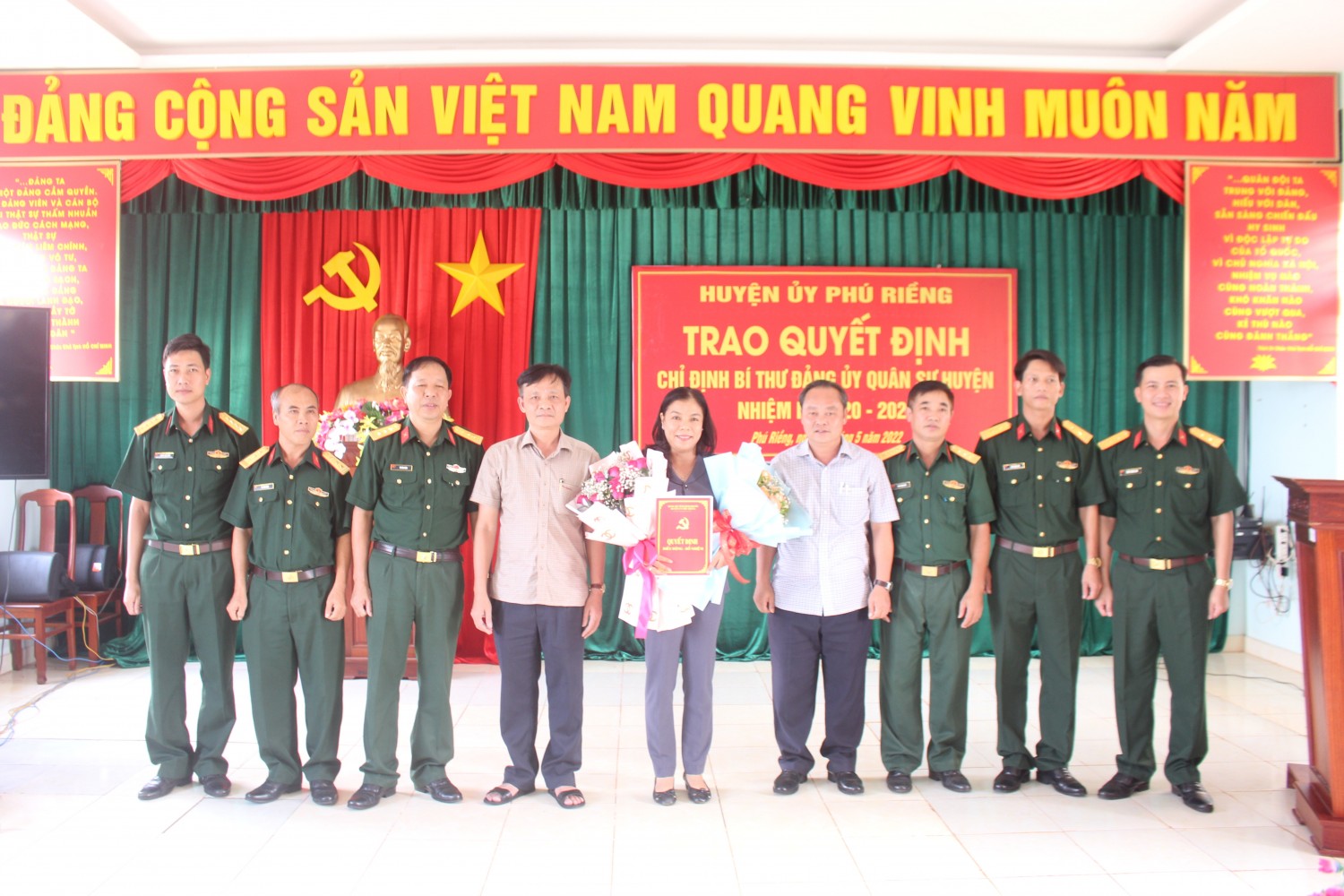 Chiều nay 5-5, Huyện ủy Phú Riềng tổ chức trao quyết định chỉ định Bí thư Đảng ủy Quân sự huyện nhiệm kỳ 2020-2025. Dự buổi lễ có đồng chí Nguyễn Thị Xuân Hòa, TUV, Bí thư Huyện ủy; Nguyễn Quốc Soài, Phó Bí thư Thường trực Huyện ủy, Chủ tịch HĐND huyện; Lê Anh Nam, Phó Bí thư, Chủ tịch UBND huyện. Lãnh đạo các Phòng của Bộ CHQS tỉnh cùng dự. Theo đó, đồng chí Trần Mạnh Tuyển, UV.BTV, Trưởng ban Tổ chức Huyện ủy thông qua Quyết định số 595-QQĐ/HU của Huyện ủy Phú Riềng chỉ định đồng chí Nguyễn Thị Xuân Hòa, TUV, Bí thư Huyện ủy tham gia Ban chấp hành Đảng bộ, giữ chức Bí thư Đảng ủy Quân sự huyện, nhiệm kỳ 2020-2025. Phát biểu nhận nhiệm vụ, đồng chí Nguyễn Thị Xuân Hòa TUV, Bí thư Huyện ủy trân trọng cảm ơn và ghi nhận những đóng góp cống hiến của đồng chí Trần Văn Lân, nguyên Bí thư Huyện ủy, nguyên Bí thư Đảng ủy Quân sự huyện đã lãnh đạo, chỉ đạo Đảng bộ huyện đạt được những quả quan trọng trong công tác quân sự, quốc phòng của địa phương. Đồng chí cho biết sẽ kế thừa những thành quả của Đảng bộ quân sự huyện, cùng các đồng chí trong Đảng bộ đồng thuận, hiệp tâm, nỗ lực cố gắng, xây dựng hoàn thành thắng lợi Nghị quyết Đại hội Đảng bộ huyện cũng như Nghị quyết Đảng bộ Quân sự huyện đã đề ra. Đồng chí Trần Mạnh Tuyển, UV.BTV, Trưởng ban Tổ chức Huyện ủy thông qua Quyết định