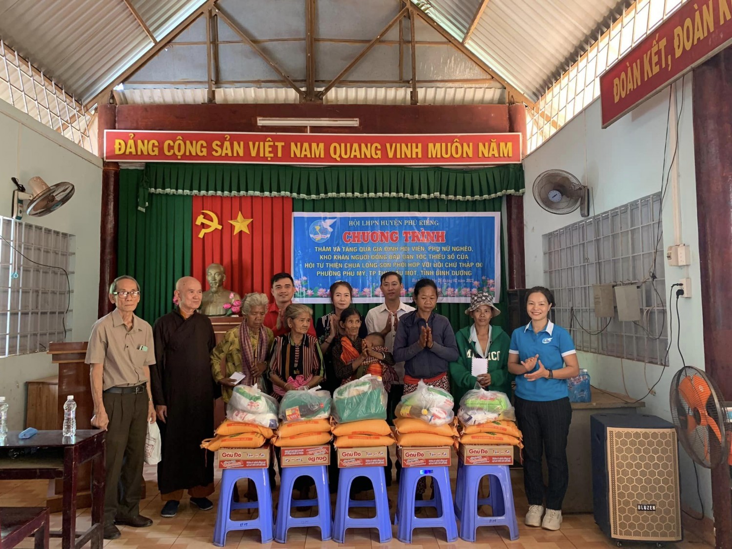 Ngày 26/02, Đoàn từ thiện của Chùa Long Sơn phối hợp với Hội Chữ thập đỏ phường Phú Mỹ thị xã Thủ Dầu Một (Bình Dương) đã đến thăm và trao tặng 150 phần quà cho chị em hội viên phụ nữ khó khăn tại 2 xã Phước Tân và Bình Sơn của huyện Phú Riềng. Đồng chí Nguyễn Quốc Soài - Phó Bí thư Thường trực Huyện uỷ; Nguyễn Thị Thanh - HUV, Chủ tịch Hội LHPN huyện tiếp và cùng đi với đoàn. Đoàn đã đến thăm và trao tặng 100 phần quà cho chị em phụ nữ khó khăn tại thôn Bình Trung, xã Phước Tân và 50 phần quà cho chị em thôn Bình Minh xã Bình Sơn với trị giá mỗi phần 600 ngàn đồng. Được biết hoạt động thiện nguyện lần này do cô Nguyễn Thị Kim Ngọc - Nguyên Phó Bí thư Huyện uỷ Hớn Quản liên hệ và kết nối để hỗ trợ cho huyện Phú Riềng. Đồng thời cô cũng là 01 trong 05 nhà hảo tâm, mạnh thường quân đã tài trợ 150 phần quà cho chương trình bao gồm: Hội từ thiện Chùa Long Sơn, Hội Chữ Thập Đỏ phường Phú Mỹ (TP. Thủ Dầu Một, tỉnh Bình Dương); Công đoàn Ngân hàng BIDV tỉnh Bình Dương; Ông Trần Hoàng Anh - Bệnh viện MeDic tỉnh Bình Dương và một số mạnh thường quân. Những phần quà đong đầy yêu thương và tình cảm của đoàn từ thiện đã phần nào chia sẻ khó khăn, động viên, khích lệ chị em phụ nữ nghèo của huyện Phú Riềng tiếp tục vươn lên trong cuộc sống. Đặc biệt là trong thời điểm huyện nhà đang sôi nổi tổ chức các hoạt động kỷ niệm ngày quốc tế PN 8/3 và hướng về phụ nữ, chuyến đi tình nguyện lần này của đoàn lại càng ý nghĩa hơn bao giờ hết. Đây sẽ là động lực để huyện Phú Riềng ngày càng thực hiện tốt hơn nữa công tác an sinh xã hội, chăm lo đời sống nhân dân trên địa bàn huyện. Nguồn tin: Dạ Thảo – Hội LHPN huyện