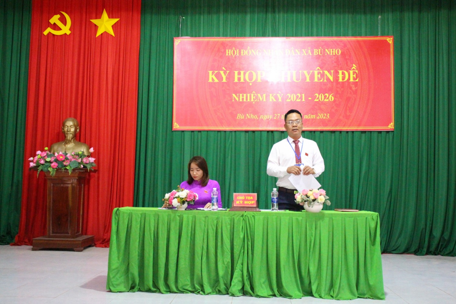 Ngày 27-2, HĐND xã Bù Nho tổ chức kỳ họp chuyên đề (Kỳ họp thứ 7), khóa XII, nhiệm kỳ 2021-2026. HUV, Phó Chủ tịch HĐND huyện Phú Riềng Lưu Đức Hiền; UV BTV huyện ủy, Bí thư Đảng ủy, Chủ tịch UBND xã Bù Nho Nguyễn Đình Quang cùng dự. Kỳ họp đã thông qua tờ trình phân khai vốn sự nghiệp kinh tế năm 2023; báo cáo của 2 Ban HĐND xã về tờ trình thuộc lĩnh vực Ban trình tại kỳ họp; báo cáo kết quả lấy ý kiến cử tri về đề án thành lập thị trấn Bù Nho, huyện Phú Riềng. Ngày 19-2 vừa qua, UBND xã Bù Nho đã tổ chức đồng loạt ở 8 thôn việc lấy ý kiến cử tri về đề án thành lập Thị trấn Bù Nho. Kết quả có 86,73% cử tri đồng ý thành lập Thị trấn Bù Nho trên cơ sở nguyên trạng diện tích, dân số của xã. 86,04% cử tri đồng ý tên gọi của thị trấn sau khi được thành lập là Thị trấn Bù Nho. Tham dự kỳ họp, các đại biểu HĐND xã Bù Nho đã tiến hành biểu quyết bằng hình thức dơ thẻ công khai đối với chủ trương thành lập thị trấn Bù Nho, thuộc huyện Phú Riềng, tỉnh Bình Phước, qua đó 100% đại biểu đồng ý. Các đại biểu dự kỳ họp chuyên đề (Kỳ họp thứ 7) HĐND xã Bù Nho, khóa XII, nhiệm kỳ 2021-2026. Chủ tọa điều hành kỳ họp.
