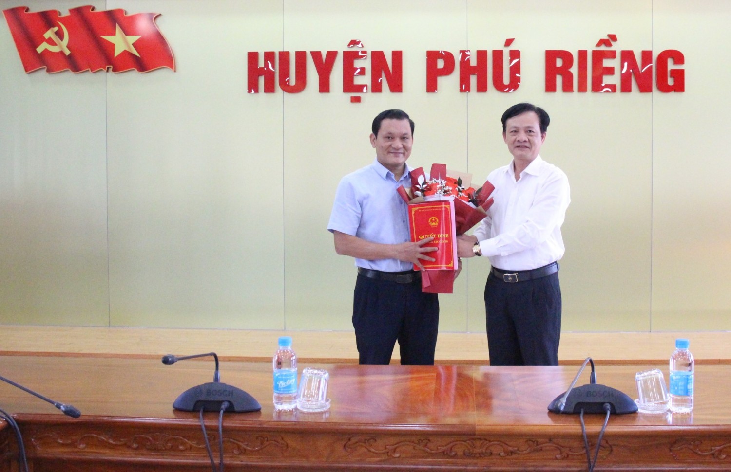 Lãnh đạo Huyện ủy- UBND huyện Phú Riềng trao quyết định và tặng hoa chúc mừng hai đồng chí.