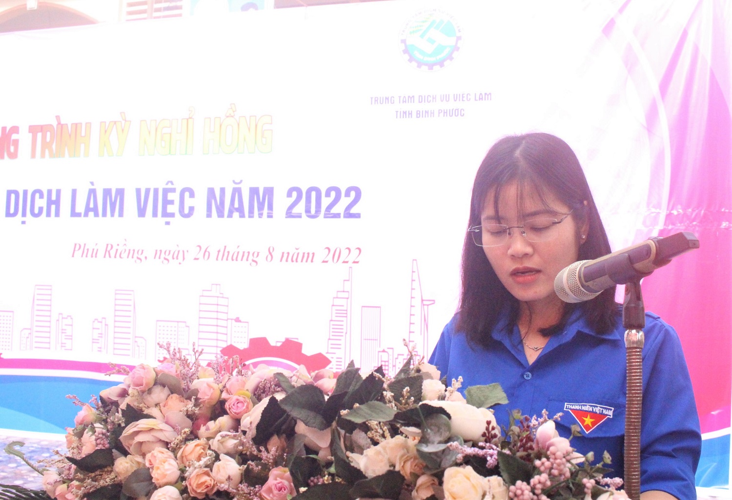 Sáng 26-8, tại trường tiểu học Bù Nho, Huyện đoàn Phú Riềng phối hợp với Hội Liên hiệp Thanh niên Việt Nam huyện và Trung tâm Giới thiệu việc làm tỉnh tổ chức Chương trình kỳ nghỉ hồng – Phiên giao dịch việc làm năm 2022. “Kỳ nghỉ hồng” là 1 trong 4 chương trình nằm trong “Chiến dịch Thanh niên tình nguyện hè năm 2022”. Với phương châm “Rộng khắp- An toàn- Hiệu quả”, trong thời gian phát động chiến dịch, Hội Liên hiệp Thanh niên huyện, cùng với tuổi trẻ đoàn khối, cán bộ, công chức, viên chức, tổ chức nhiều hoạt động như: Thăm tặng quà gia đình chính sách, bệnh nhân có hoàn cảnh khó khăn, phối hợp khám bệnh, cấp phát thuốc miễm phí cho gần 1.000 người dân tại các xã; tặng 95 phần quà tiếp sức đến trường; vận động xây tặng 1 căn nhà thanh niên, 1 tuyến đường thắp sáng,.... Đặc biệt, chú trọng hỗ trợ người dân tham gia chuyển đổi số. Tham gia Chương trình, các đoàn viên, thanh niên trên địa bàn huyện Phú Riềng đã được triển khai các thông tin về chủ trương, chính sách của nhà nước trong học nghề, giải quyết việc làm, các hoạt động đào tạo nghề. Đại diện doanh nghiệp và đơn vị đào tạo nghề trình bày các cơ hội việc làm trong nước và nước ngoài, học nghề. Đồng thời các đơn vị đã trao đổi trực tiếp, tư vấn cho đoàn viên, thanh niên có nhu cầu tìm kiến việc làm. Dịp này, Huyện đoàn Phú Riềng và Hội Liên hiệp Thanh niên Việt Nam huyện trao tặng 10 suất học bổng và 25 phần quà, trị giá trên 20 triệu đồng cho các em học sinh có hoàn cảnh khó khăn./. Chị Lưu Thị Phúc- Phó Bí thư Huyện đoàn, Chủ tịch Hội Liên hiệp Thanh niên Việt Nam huyện phát biểu khai mạc Chương trình. Ông Trần Đại Kỳ-Giám đốc Trung tâm Dịch vụ việc làm tỉnh phát biểu tại Chương trình. Các đại biểu dự Chương trình Kỳ nghỉ hồng. Các bạn đoàn viên, thanh niên dự chương trình.