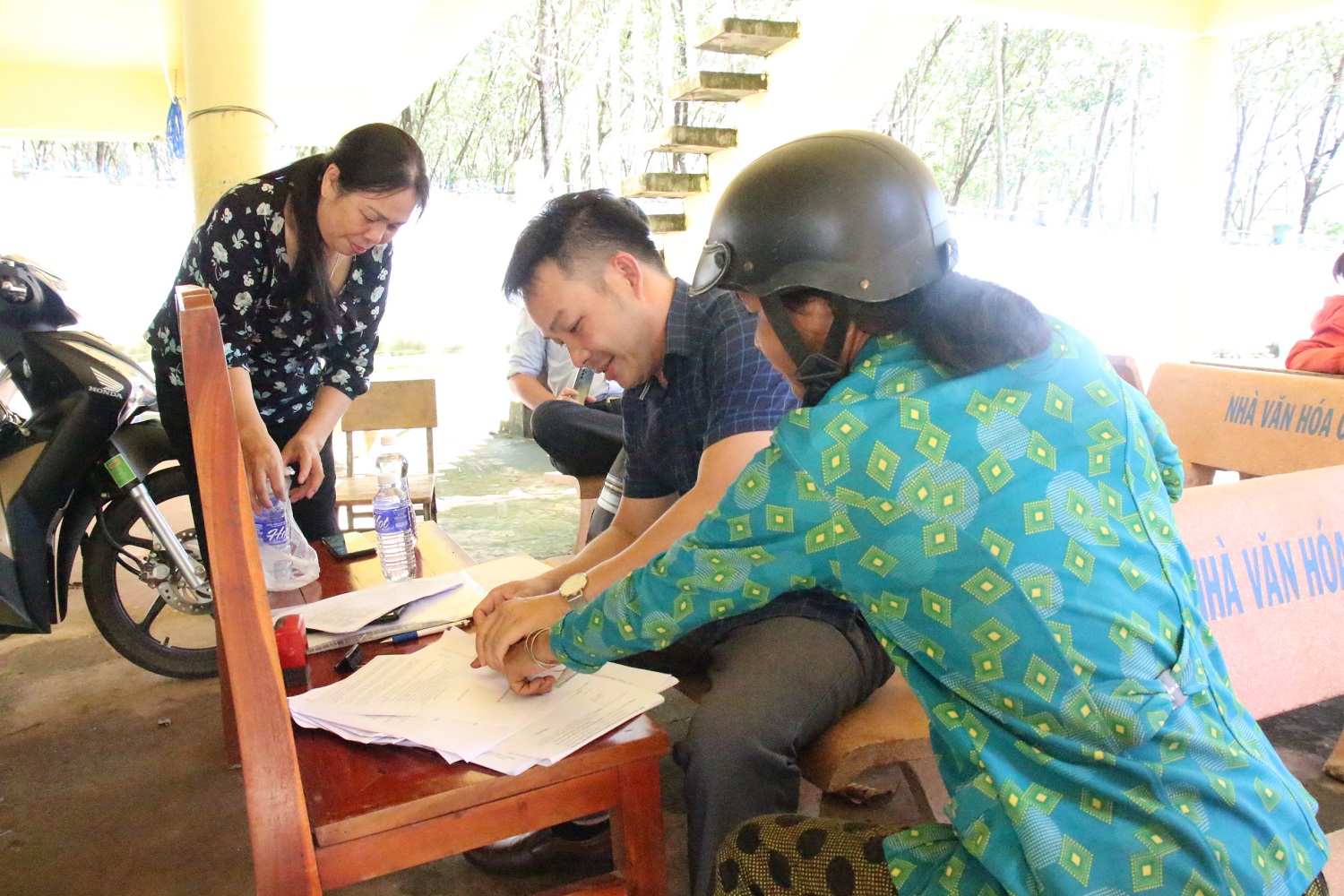 Người dân thực hiện thủ tục trước khi nhận bò giống và nông cụ sản xuất. Người dân được nhận nông cụ sản xuất rất phấn khởi.