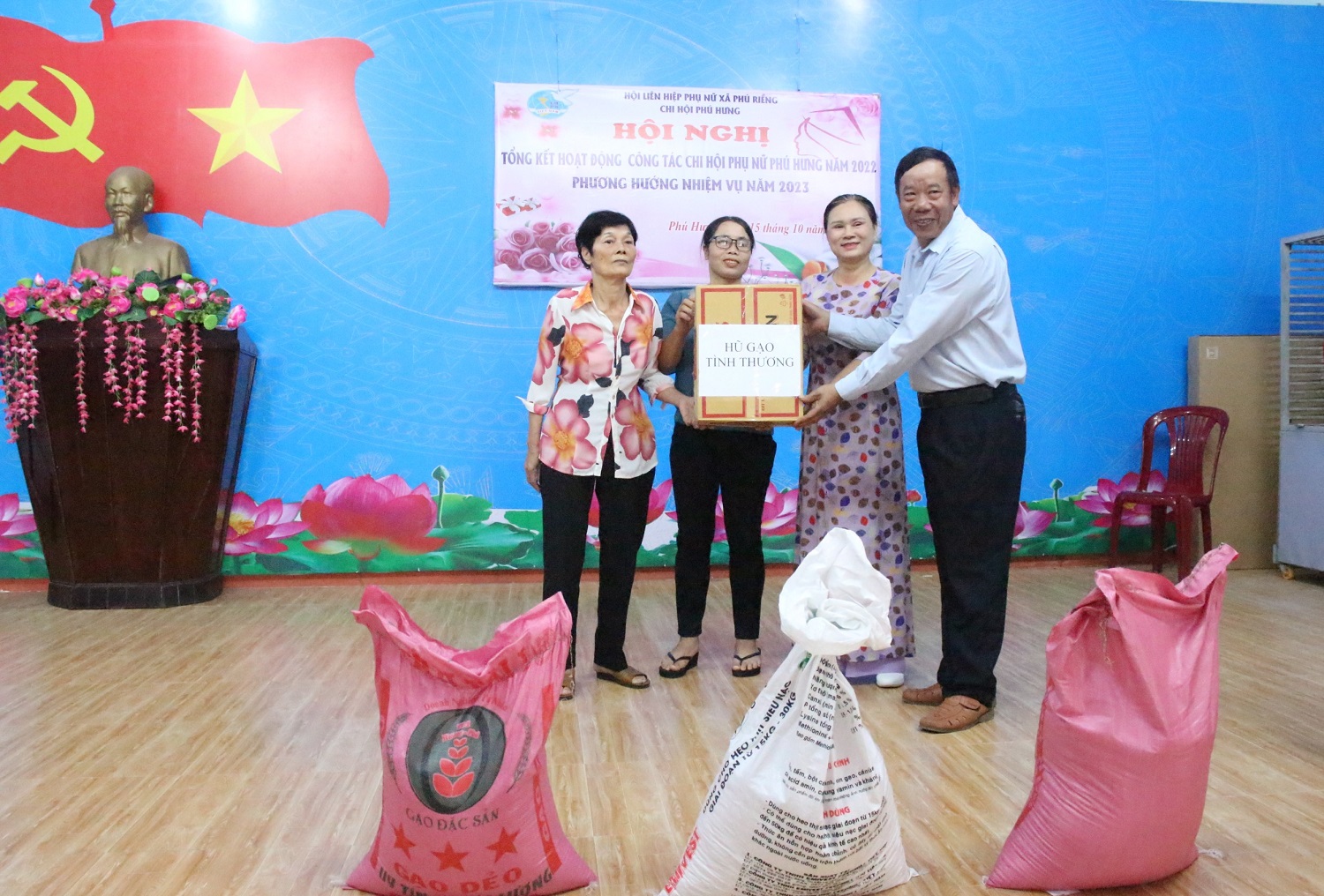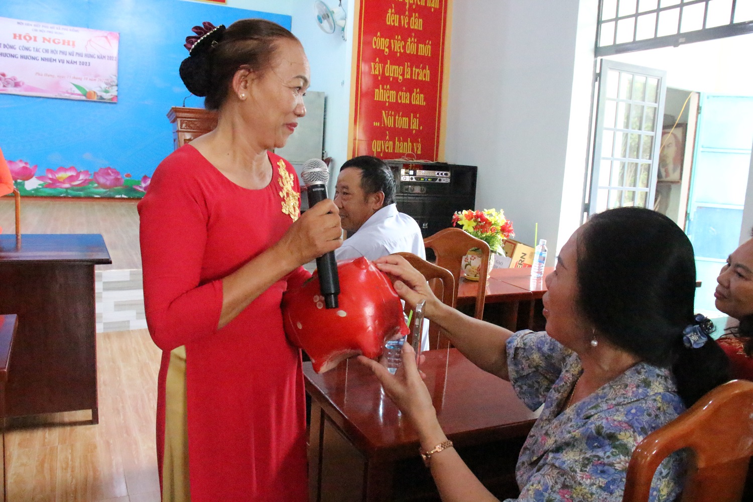 Chiều 15-10, Chi hội phụ nữ thôn Phú Hưng, xã Phú Riềng, huyện Phú Riềng tổ chức Hội nghị tổng kết công tác hội năm 2022 và ra mắt Câu lạc bộ dân vũ. Đặc biệt, Hội nghị có sự hiện diện của Phó Bí thư Tỉnh ủy, Chủ tịch UBND tỉnh Trần Tuệ Hiền, đây là niềm vui, niềm vinh dự của chi hội khi được hội viên danh dự về tham dự. Đến dự Hội nghị từ rất sớm, Phó Bí thư Tỉnh ủy, Chủ tịch UBND tỉnh Trần Tuệ hiền đã tranh thủ thời gian để trò chuyện, nắm bắt tâm tư nguyện vọng của các hội viên ở cơ sở. Lãnh đạo xã Phú Riềng, Ban thôn Phú Hưng, cùng đông đảo chị em hội viên phụ nữ rất phấn khởi, vui mừng khi nhận được sự quan tâm, gần gủi của lãnh đạo tỉnh. Qua đó thẳng thắn chia sẻ những thuận lợi, khó khăn trong công tác Hội. Chị Phạm Thị Thuyết, UV BTV Hội LHPN xã Phú Riềng, Chi hội phó, Chi hội Phụ nữ thôn Phú Hưng cho biết: “Chi hội phụ nữ thôn rất trân trọng sự tham dự của Hội viên danh dự là Phó Bí thư tỉnh ủy, Chủ tịch UBND tỉnh Trần Tuệ Hiền. Dẫu biết chị vô cùng bận rộn, nên dù đã gửi thư mời nhưng nghĩ với trăm công nghìn việc chị Hiền sẽ không có thời gian về dự. Thế nhưngchị đã đến rất sớm và cùng chị em dự xuyên suốt Hội nghị, góp ý từng chi tiết nhỏ để chị em rút kinh nghiệm trong công tác tổ chức, bản thân tôi và các chị em hội viên rất vui, xúc động trước những cử chỉ ân cần thăm hỏi, động viên; sự quan tâm, gần gủi cơ sở đó là niền vui lớn, là động lực để chị em chúng tôi tiếp tục nỗ lực, phấn đấu”. Báo cáo tại Hội nghị, chị Nguyễn Thị Kim Oanh, Chi Hội trưởng, Chi hội phụ nữ thôn Phú Hưng cho biết: Chi hội phụ nữ thôn Phú Hưng, xã Phú Riềng có 156 hội viên, sinh hoạt ở 6/6 tổ hội, Năm 2022, chi hội đã triển khai thực hiện tốt các phong trào thi đua, cuộc vận động. Phối hợp với ban thôn và các hội đoàn thể tổ chức trung thu, tặng quà cho các cháu thiếu nhi; thăm 14 lượt hội viên ốm đau; chi hộiđược Hội LHPN xã chọn làm mô hình điểm về “Phụ nữ với phong trào sạch mọi nơi, đẹp mọi chỗ”. Xây dựng quỹ giúp nhau phát triển kinh tế được 50 triệu đồng, cho 8 chị vay; quỹ đi bộ được trên 51 triệu đồng, cho 5 chị vay; thành lập 1 tổ vốn xoay vòng có 12 thành viên với tổng số tiền 288 triệu đồng. Chi hội có 1 câu lạc bộ gia đình hạnh phúc, 1 câu lạc bộ dưỡng sinh, 11 địa chỉ nhân đạo... Lồng ghép tại Hội nghị, Ban tổ chức đã phát động nuôi heo đất và hủ gạo tình thương, qua đó được đông đảo chị em hội viên hưởng ứng. Đồng thời, ra mắt câu lạc bộ dân vũ thôn Phú Hưng, xã Phú Riềng với 20 thành viên, trong đó chị Đặng Thị Thanh, làm chủ nhiệm câu lạc bộ. Sau khi nghe báo cáo hoạt động của Chi hội, Phó Bí thư Tỉnh ủy, Chủ tịch UBND tỉnh Trần Tuệ Hiền rất phấn khởi trước những kết quả mà chi hội đã đạt được trong năm qua, dịp này, đồng chí cũng có món quà gửi tặng chúc mừng Chi hội nhân dịp kỷ niệm 92 năm thành lập hội LHPV VN. Phó Bí thư Tỉnh ủy, Chủ tịch UBND tỉnh Trần Tuệ Hiền dự Hội nghịtổng kết công tác phụ nữ thôn Phú Hưng. Đông đảo hội viên cùng dự Hội nghị. Quỹ hủ gạo tình thương hỗ trợ các hôi viên có hoàn cảnh khó khăn. Đông đảo hội viên phụ nữ thôn Phú Hưng hưởng ứng phao trào nuôi heo đất. Trao quyết định và ra mắt câu lạc bộ dân vũ thôn Phú Hưng, xã Phú Riềng.