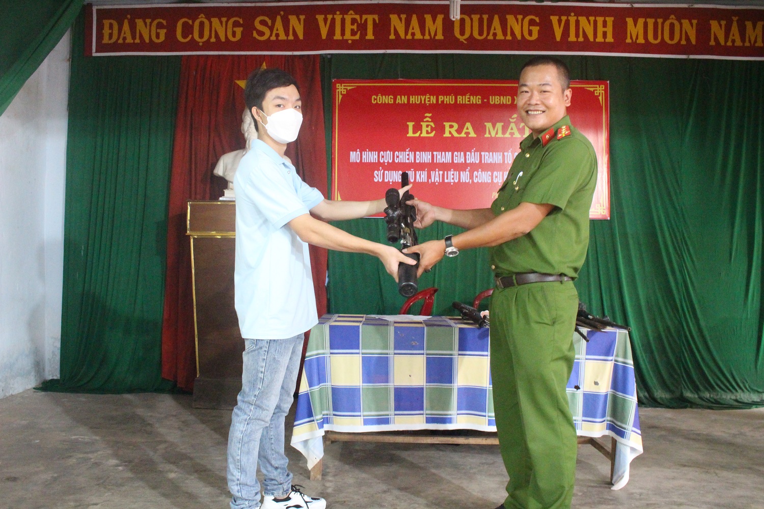 Chiều 2-6, tại nhà văn hóa thôn Phú Thành, xã Phú Riềng, Đội Cảnh sát Quản lý hành chính về trật tự xã hội, công an huyện Phú Riềng, phối hợp với UBND xã Phú Riềng tổ chức Lễ ra mắt Mô hình phòng chống tội phạm. Thượng tá Nguyễn Văn Đợi- Phó trưởng Phòng Xây dựng Phong trào Bảo vệ An ninh Tổ Quốc, Công an tỉnh; thượng tá Phạm Văn Thép, Phó Trưởng công an huyện, đồng chí Ngọ Doãn Phúc- Bí thư Đảng ủy xã cùng dự. Tại buổi Lễ, lực lượng Công an đã công bố quyết định thành lập mô hình phòng chống tội phạm với tên gọi “Cựu chiến binh tham gia đấu tranh tố giác hành vi tàng trữ, sử dụng vũ khí, vật liệu nổ, công cụ hỗ trợ, và pháo” gồm 11 thành viên, trong đó, ông Nguyễn Gia Xuân, Chi hội trưởng Chi hội Cựu chiến binh Thôn Phú Thành, xã Phú Riềng làm tổ trưởng. Thượng tá Phạm Văn Thép, Phó Trưởng Công an huyện Phú Riềng cho biết: Tình hình ANTT trên địa bàn thôn Phú Thành nói riêng, xã Phú Riềng nói chung, thời gian qua tương đối ổn định, tuy nhiên vẫn còn tình trạng người dân nơi khác đến sử dụng súng tự chế để săn bắn chim, thú; vào các dịp Tết Nguyên đán người dân còn tàng trữ, vận chuyển, sử dụng pháo trái phép gây mất an ninh trật tự. Đồng chí mong muốn, sau khi thành lập, mô hình “Cựu chiến binh tham gia đấu tranh tố giác hành vi tàng trữ, sử dụng vũ khí, vật liệu nổ, công cụ hỗ trợ, và pháo”, các thành viên tiếp tục phát huy, giữ vững phẩm chất “Bộ đội cụ Hồ” đoàn kết vững mạnh, vận động Hội viên và bà con trong thôn tích cực tham gia phong trào toàn dân đấu tranh, tố giác tội phạm và các hành vi vi phạm pháp luật , đặc biệt là các hành vi có liên quan đến vũ khí, vật liệu nổ, công cụ hỗ trợ. Ngay sau lễ ra mắt, Ban tổ chức mô hình Phòng chống tội phạm, đã vận động người dân trên địa bàn thôn giao nộp 4 khẩu súng hơi tự chế và 6 vũ khí thô sơ, đây là các vũ khí người dân nhặt được trong quá trình đi làm vườn, rẫy. Lãnh đạo xã Phú Riềng tặng hoa chúc mừng mô hình“Cựu chiến binh tham gia đấu tranh tố giác hành vi tàng trữ, sử dụng vũ khí, vật liệu nổ, công cụ hỗ trợ, và pháo”. Ngay sau lễ ra mắt Mô hình, người dân thôn Phú Thành đã tự nguyện giao nộp súng và nhiều vũ khí thô sơ.