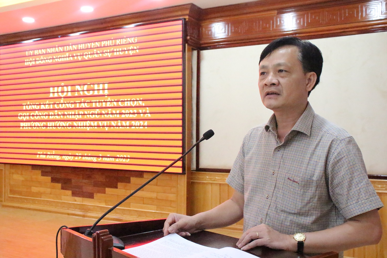 Sáng 29-3, Hội đồng Nghĩa vụ quân sự (NVQS) huyện Phú Riềng tổ chức hội nghị tổng kết công tác tuyển chọn, gọi công dân ngập ngũ năm 2023. Năm 2023, công tác tuyển chọn, gọi công dân nhập ngũ được Hội đồng NVQS huyện Phú Riềng triển khai hiệu quả. Các bước được thực hiện đồng bộ, chặt chẽ, đúng quy định, đủ chỉ tiêu và đảm bảo chất lượng. Tổng số giao quân năm 2023 của huyện là 134 thanh niên, đạt 100% chỉ tiêu trên giao, trong đó: thực hiện nghĩa vụ quân sự 105 thanh niên, nghĩa vụ công an 29 thanh niên; có 3 đảng viên chính thức; 131 đoàn viên; tốt nghiệp THPT 51 thanh niên; trình độ trung cấp, cao đẳng, đại học 10 thanh niên; có 70 thanh niên tình nguyện ngập ngũ. Hội trại tòng quân được tổ chức với nhiều nội dung, hình thức đa dạng, đảm bảo chất lượng, tạo không khí phấn khởi cho thanh niên trước khi lên đường nhập ngũ. Công tác giao, nhận quân diễn ra nhanh gọn, an toàn, đúng quy định. Tại hội nghị, lãnh đạo Bộ CHQS tỉnh và lãnh đạo huyện Phú Riềng biểu dương nỗ lực của các cấp, ngành, chính quyền các xã đã thực hiện tốt các bước trong tuyển chọn, gọi công dân nhập ngũ năm 2023. Đồng thời đề nghị, năm 2024 tiếp tục đẩy mạnh tuyên truyền; hội đồng NVQS các cấp thực hiện tốt công tác tham mưu cho cấp ủy, chính quyền địa phương, triển khai đồng bộ các khâu, các bước tuyển chọn, gọi công dân nhập ngũ, chú trọng quản lý nguồn và chất lượng tuyển quân; làm tốt công tác hậu phương quân đội; quan tâm, tạo điều kiện cho quân nhân xuất ngũ có việc làm, ổn định cuộc sống. Dịp này, Chủ tịch UBND huyện Phú Riềng tặng giấy khen cho 7 tập thể và 16 cá nhân có thành tích tốt trong công tác tuyển chọn, gọi công dân nhập ngũ và hộitrại tòng quân năm 2023./. Đại tá Phạm Khắc Toán- Uỷ viên Ban thường vụ Tỉnh ủy, Phó Chỉ huy trưởng, Tham mưu trưởng Bộ Chỉ huy quân sự tỉnh dự và phát biểu tại Hội nghị. Phó Bí thư, Chủ tịch UBND huyện, Chủ tịch HĐNVQS huyện Phú Riềng Lê Anh Nam phát biểu tại Hội nghị. Toàn cảnh Hội nghị Các thành viên HĐNVQS huyện dự hội nghị. Chủ tịch UBND huyện tặng giấy khen cho các tập thể, cá nhân có thành tích tốt trong công tác tuyển chọn, gọi công dân nhập ngũ và Hội trại tòng quân năm 2023.