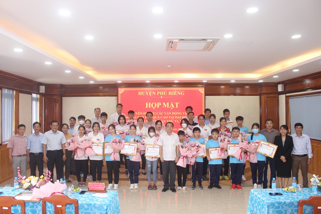 Chiều 12-10, UBND huyện Phú Riềng tổ chức họp mặt tuyên dương các vận động viên đơn vị đạt kết quả cao tại Đại hội TDTT tỉnh Bình Phước lần thứ VI, năm 2022. Dự buổi họp mặt có UV.BTV, Phó Chủ tịch UBND huyện Bùi Văn Hiếu. Việc tuyên dương này nhằm vinh danh, động viên, khuyến khích các huấn luyện viên, vận động viên tiếp tục phát huy thành tích cao hơn nữa trong những năm tiếp theo. Qua đó, đáp ứng bồi dưỡng nguồn nhân lực cho thể thao huyện nhà. Tại Đại hội TDTT tỉnh, huyện Phú Riềng có 200 vận động viên tham gia với 10 môn thi đấu: Việt dã, cờ tướng, bóng chuyền nam, karate, taekwondo… Với tinh thần tập luyện nghiêm túc, thi đấu hết mình và giành 22 huy chương các loại. Trong đó, 5 huy chương vàng, 7 huy chương bạc và 10 huy chương đồng. Phát biểu tại buổi gặp mặt, Phó Chủ tịch UBND huyện Bùi Văn Hiếu chúc mừng thành công và ghi nhận những đóng góp của các vận động viên, huấn luyện viên tại đại hội. Đồng chí mong muốn các bạn giữ vững ý chí, quyết tâm, tiếp tục phát huy kết quả đạt được, không ngừng tập luyện để đạt nhiều thành tích cao hơn nữa, đóng góp cho sự nghiệp thể thao huyện nhà. Phó Chủ tịch UBND huyện Bùi Văn Hiếu đề nghị: ngành văn hóa thể thao cần tiếp tục đẩy mạnh huấn luyện, duy trì, củng cố vị thế thể thao thành tích cao của huyện; đặt ra mục tiêu đào tạo, ươm mầm hạt giống tiếp tục phát triển. Các địa phương, tổ chức, cá nhân, huấn luyện viên, vận động viên cần đẩy mạnh phong trào TDTT rộng khắp, cho mọi đối tượng quần chúng nhân dân. Đặc biệt, tiếp tục đầu tư có trọng điểm các môn thi đấu thể thao thành tích cao phấn đấu nâng tầm vị thế thể thao Phú Riềng vươn cao hơn nữa. Dịp này, 1 tập thể và 22 vận động viên, nhóm vận động viên đạt thành tích cao được UBND huyện Phú Riềng tuyên dương, khen thưởng./. Phó Chủ tịch UBND huyện Bùi Văn Hiếu phát biểu tại buổi họp mặt UVBTV - Phó Chủ tịch UBND huyện Bùi Văn Hiếu tặng giấy khen cho các vận động viên đạt thành tích cao Tuyên dương khen thưởng cho các vận động viên, nhóm vận động viên đạt huy chương đồng Lãnh đạo huyện chụp hình lưu niệm cùng các vận động viên, nhóm vận động viên đạt thành tích cao