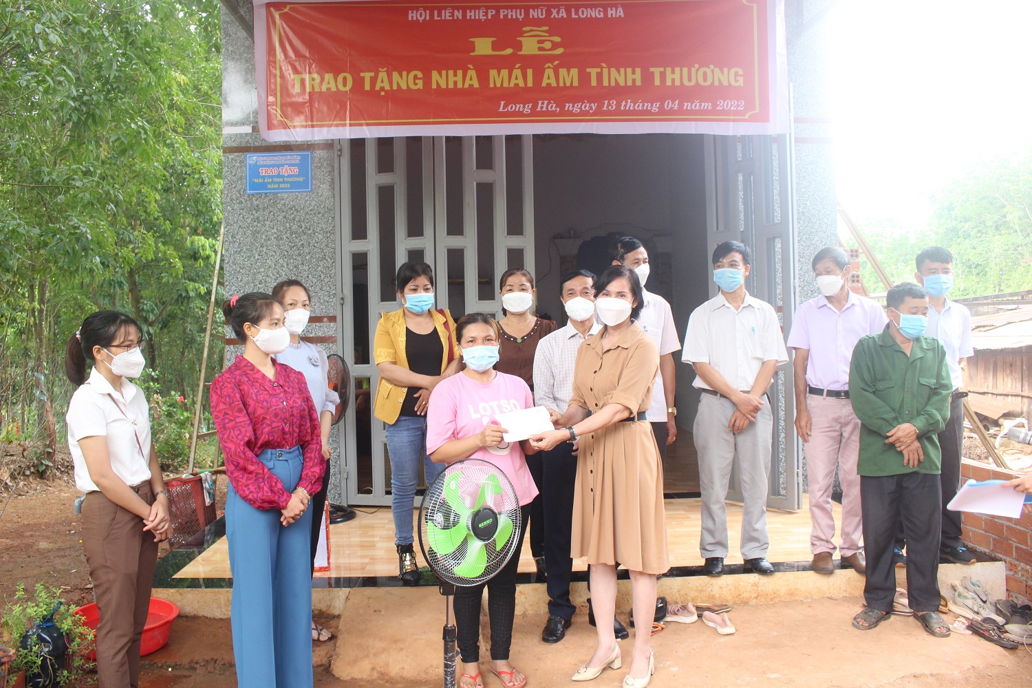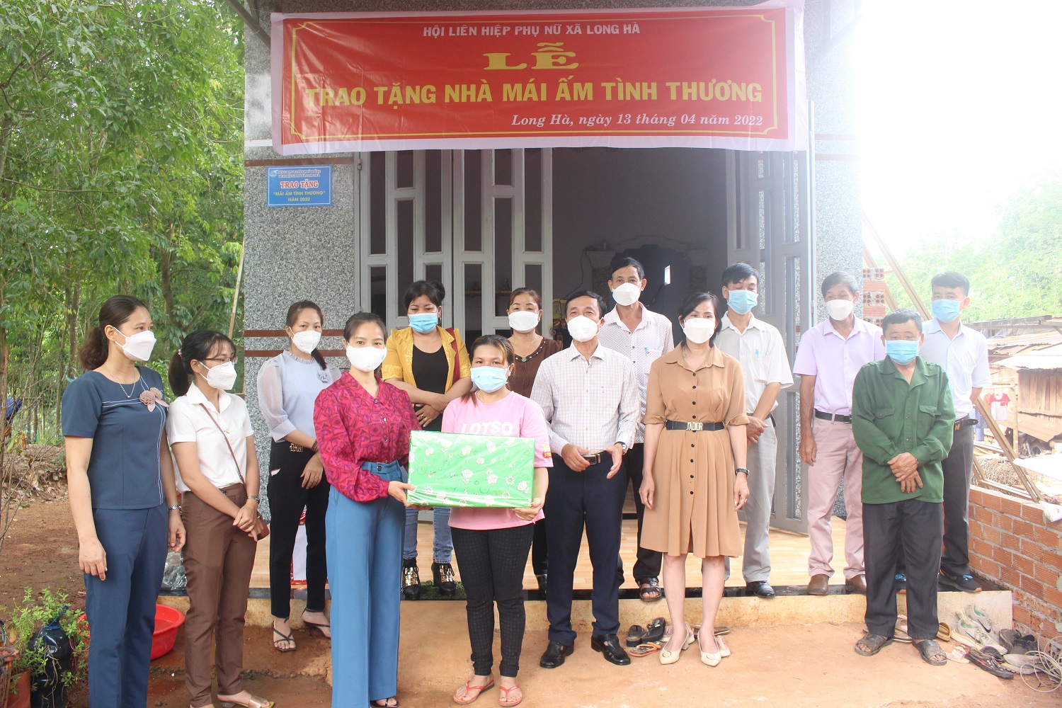 Sáng 13-4, Hội Liên hiệp Phụ nữ (LHPN) xã Long Hà tổ chức trao tặng nhà mái ấm tình thương cho hộ chị Trương Thị Chanh, 35 tuổi, ngụ thôn Thanh Long, xã Long Hà. Các đồng chí: Nguyễn Thị Hương – HUV, Phó Trưởng Ban Dân vận; Nguyễn Thị Thanh – HUV, Chủ tịch Hội LHPN huyện Phú Riềngvà lãnh đạo xã Long Hà, Ban thôn Thanh Long cùng dự. Căn nhà có diện tích sử dụng 90m2, kinh phí xây dựng 87 triệu đồng, trong đó, Qũy “Vì người nghèo” xã Long Hà hỗ trợ 25 triệu đồng, hội LHPN xã Long Hà hỗ trợ 25 triệu động, gia đình chị Chanh đóng góp số còn lại và công xây dựng. Gia đình chị Chanh thuộc diện cận nghèo, chồng chị bị bệnh, mất sức lao động, chị Chanh là trụ cột trong gia đình vừa chăm chồng, vừa làm thuê, làm mướn kiếm tiền nuôi ba con nhỏ. Được sự quan tâm của chính quyền địa phương và lãnh đạo các cấp, xây tặng căn nhà mới khang trang, chị Chanh rất xúc động, cảm ơn các cấp chính quyền, các hội đoàn thể và hứa sẽ tiếp tục cố gắng lao động nuôi dạy con cái. Dịp này, Huyện ủy Phú Riềng cũng tặng gia đình sổ tiết kiệm trị giá 1 triệu đồng, Hội LHPN huyện, Hội Chữ Thập đỏ huyện, xã Long Hà, Ban thôn Thanh Long và Chi hội phụ nữ thôn cũng có những phần quà là đồ dùng sinh hoạt hàng ngày gửi tặng gia đình./. Đồng chí Nguyễn Thị Thanh- HUV, Chủ tịch Hội LHPN huyện trao quyết định tặng nhà cho hộ chị Trương Thị Chanh. Đồng chí Nguyễn Thị Hương- HUV, Phó Trưởng Ban Dân vận trao tặng sổ tiết kiệm cho gia đình. Hội LHPN huyện tặng quà chúc mừng gia đình.