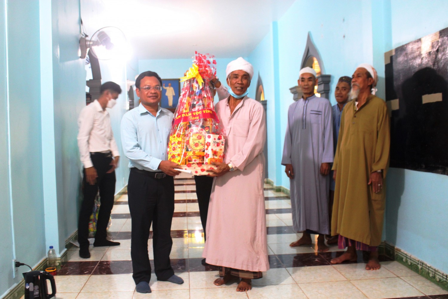Nhân tháng lễ Ramadan của đồng bào Chăm, ngày 4-5, Ban Dân tộc tỉnh và huyện Phú Riềng do ông Điểu Nên, Phó trưởng ban Dân tộc tỉnh và ông Bùi Văn Hiếu - UVBTV, Phó Chủ tịch UBND huyện làm trưởng đoàn đã đến thăm, chúc mừng cộng đồng người Chăm đang sinh sống tại thôn Phú Vinh, xã Phú Riềng. Lãnh đạo ban Dân tộc tỉnh và huyện Phú Riềng đã thăm hỏi sức khỏe, đời sống của người Chăm và gửi lời chúc sức khỏe, hạnh phúc, bình an nhân dịp đồng bào đón tháng lễ RAMADAN. Mong muốn cộng đồng người Chăm sẽ đoàn kết, thực hiện tốt chủ trương, đường lối của Đảng, chính sách, pháp luật của nhà nước; giữ vững khối đại đoàn kết dân tộc; chăm lo cho con em học tập tốt; phát triển kinh tế, góp phần xây dựng quê hương giàu mạnh. Đại diện cộng đồng người Chăm, Giáo cả bày tỏ lòng biết ơn sự quan tâm của các cấp ủy Đảng, chính quyền đã chăm lo đời sống cho người dân, đặc biệt với cộng đồng người Chăm nhân dịp tháng lễ Ramadan truyền thống. Giáo cả hứa đồng bào Chăm sẽ đoàn kết cùng các dân tộc anh em trên địa bàn tỉnh xây dựng quê hương ngày thêm giàu đẹp. Dịp này, lãnh đạo Ban Dân tộc tỉnh và huyện Phú Riềng tặng quà cộng đồng người Chăm, các cá nhân uy tín tiêu biểu và các em học sinh nghèo hiếu học./. Ông Điểu Nên, Phó Trưởng ban Dân tộc tỉnh và UVBTV, Phó Chủ tịch UBND huyện Bùi Văn Hiếu tặng quà cộng đồng người Chăm