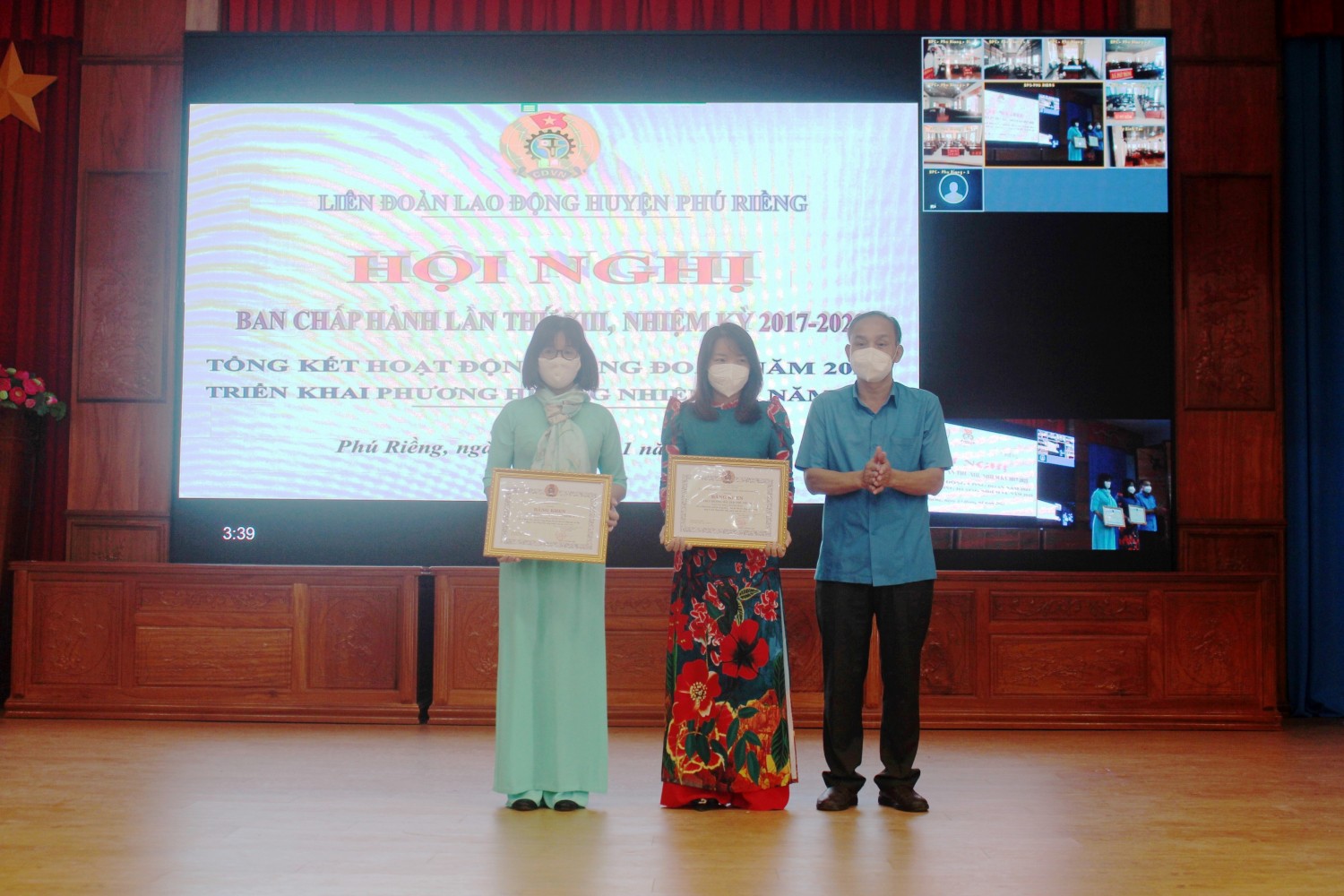 Sáng 13-1, Liên đoàn lao động (LĐLĐ) huyện tổ chức hội nghị ban chấp hành lần thứ 13, nhiệm kỳ 2017-2022 tổng kết hoạt động công đoàn năm 2021, phương hướng nhiệm vụ năm 2022. Ông Nguyễn Thành Lai, Phó Chủ tịch thường trực LĐLĐ tỉnh; Nguyễn Quốc Soài, Phó Bí thư Thường trực Huyện ủy cùng dự. LĐLĐ huyện Phú Riềng hiện có 87 công đoàn cơ sở với 2.447 đoàn viên. Năm 2021, LĐLĐ huyện đã tích cực, chủ động tham mưu xây dựng các hướng dẫn, triển khai các quy định pháp luật có liên quan trực tiếp; chăm lo quyền, lợi ích hợp pháp chính đáng của đoàn viên, người lao động. Với phương châm “Vừa chống dịch vừa phát triển kinh tế”, đoàn viên, công nhân viên chức, người lao động trong huyện tích cực hoàn thành tốt nhiệm vụ được giao. Trong năm, các công đoàn cơ sở chăm lo đời sống, tặng quà cho 875 người lao động, trị giá hơn 437 triệu đồng; hỗ trợ xây dựng 03 nhà “Mái ấm công đoàn” trị giá 180 triệu đồng; trao tặng 200 phần quà cho công nhân có hoàn cảnh khó khăn bị ảnh hưởng bởi dịch bệnh; vận động được hơn 116 triệu đồng vào “Quỹ xã hội công đoàn năm 2021”; ủng hộ 400 triệu đồng cho chương trình “Sóng và máy tính cho em”; tiền lương bình quân của công nhân lao động khu vực doanh nghiệp trên địa bàn huyện từ 4,5 triệu đồng – 5,5 triệu đồng/người… Ông Nguyễn Thành Lai, Phó Chủ tịch LĐLĐ tỉnh đánh giá cao những kết quả đạt được, đồng thời đề nghị LĐLĐ huyện nghiên cứu các chính sách pháp luật liên quan tới người lao động, nhất là chính sách hỗ trợ người lao động gặp khó khăn do dịch covid 19. Tập trung thực hiện các chỉ tiêu, mục tiêu đại hội công đoàn các cấp đúng tiến độ. Phát huy vai trò công đoàn trong chăm lo, bảo vệ quyền lợi hợp pháp, chính đáng cho đoàn viên, người lao động. Đồng chí Nguyễn Quốc Soài, Phó Bí thư Thường trực Huyện ủy yêu cầu: LĐLĐ huyện tăng cường tuyên truyền chủ trương, nghị quyết của Đảng, pháp luật của Nhà nước; bảo vệ quyền lợi ích hợp pháp chính đáng của người lao động, đặc biệt là lao động trong các doanh nghiệp; hỗ trợ đoàn viên, người lao động khó khăn vươn lên trong cuộc sống; chăm lo Tết nguyên đán công nhân, người lao động sắp tới. Làm tốt công tác nắm bắt dư luận phản biện xã hội trong các doanh nghiệp. Mong muốn LĐLĐ tỉnh tạo mọi điều kiện hỗ trợ giúp đỡ LĐLĐ huyện hoạt động hiệu quả cùng các cấp các ngành thực hiện nhiệm vụ phát triển kinh tế xã hội của địa phương. Dịp này, 21 tập thể, 49 cá nhân được các Tổng LĐLĐ Việt Nam, LĐLĐ tỉnh, LĐLĐ huyện tuyên dương, khen thưởng. Các tập thể, cá nhân được Tổng LĐLĐ Việt Nam, LĐLĐ tỉnh, LĐLĐ huyện tuyên dương, khen thưởng. Phó Bí thư Thường trực Huyện ủy Nguyễn Quốc Soài phát biểu chỉ đạo Toàn cảnh hội nghị