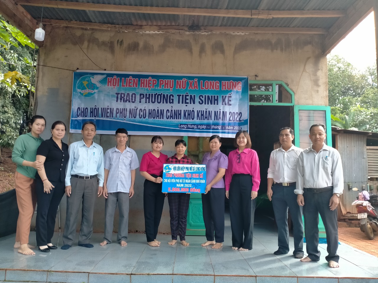 * Tại xã Long Hưng: Sáng ngày 16/9/2022, Hội LHPN xã Long Hưng tổ chức trao phương tiện sinh kế cho hội viên phụ nữ có hoàn cảnh khó khăn; Tham dự chương trình có bà Nguyễn Thị Thanh – HUV, Chủ tịch Hội LHPN huyện, ông Phạm Xuân Phước – Phó Bí thư TT Đảng ủy xã, ông Trương Văn Thập – Chủ tịch UBMTTQVN xã, Thường trực Hội LHPN xã cùng đại diện ban thôn, chi hội phụ nữ các thôn cùng tham dự. Thực hiện chương trình hỗ trợ phụ nữ phát triển kinh tế trong năm 2022, qua khảo sát và nắm bắt nhu cầu, nguyện vọng của hội viên phụ nữ nghèo, khó khăn tại địa phương, Ban chấp hành Hội LHPN xã Long Hưng đã vận động các chị em hội viên trong toàn xã ủng hộ để trao phương tiện sinh kế cho 02 hộ phụ nữ có hoàn cảnh khó khăn trên địa bàn xã với tổng số tiền 10.000.000 đồng. Cụ thể: Đoàn đã đến thăm và trao tặng nguồn vốn sinh kế cho chị Bùi Thị Huế, thôn 1 hỗ chợ chăn nuôi và chị Phạm Thị Thoán, thôn 8 hỗ trợ buôn bán với số vốn 5.000.000đ/người. *Tại xã Long Hà: Chiều ngày 16/9, Hội LHPN xã Long Hà đã trao phương tiện sinh kế cho hội viên có hòan cảnh khó khăn tại thôn Bù Ka 2, xã Long Hà. Cùng tham dự có đồng chí Hoàng Văn Lư–UV.BTV Đảng ủy- Chủ tịch UBMTTQVN xã và chi bộ, ban thôn, ban ngành đoàn thể thôn Bù Ka 2. Nằm trong hoạt động “Trao yêu thương, nhận nụ cười” hội LHPN xã Long Hà đã trao cho hộ chị Thị Tiên 2 con heo giống trị giá 3 triệu đồng. Chị Thị Tiên sinh năm 1992,gia đình có 4 khẩu, 2 con còn nhỏ, 2 vợ chồng làm thuê, công việc không ổn định, kinh tế gia đình còn khó khăn, xét thấy việc gia đình chị công việc bấp bênh nên có thời gian rảnh rỗi để chăn nuôi heo, Hội LHPN xã đã trao heo giống để tạo điều kiện cho gia đình chị phát triển kinh tế. Với hoạt động này, Hội LHPN huyện, xã và chính quyền địa phương cũng mong muốn các chị sẽ sử dụng hiệu quả nguồn vốn sinh kế đạt hiệu quả, phát triển kinh tế, vươn lên ổn định cuộc sống, từ đó góp phần tích cực vào thực hiện tốt chương trình an sinh xã hội của địa phương. Đoàn trao vốn sinh kế cho gia đình chị Thạm Thị Thoán – Thôn 8, xã Long Hưng