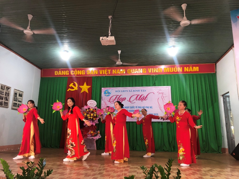 Chiều 6/3, Hội LHPN xã Bình Tân, huyện Phú Riềng tổ chức chương trình họp mặt kỷ niệm 113 năm Ngày Quốc tế Phụ nữ (8/3/1910 – 8/3/2023) và 1983 năm cuộc khởi nghĩa Hai Bà Trưng. Đến dự có các đồng chí: Nguyễn Hoàng Anh – HUV, Bí thư Đảng ủy xã, đồng chí Vương Thị Liên – UV.BTV Hội LHPN huyện; đồng chí Võ Phong Tỏa – Phó Chủ tịch UBND xã cùng lãnh đạo các phòng ban xã và 100 chị em hội viên phụ nữ xã Bình Tân. Tại lễ kỷ niệm, các đại biểu đã cùng nhau ôn lại ý nghĩa lịch sử ra đời Ngày Quốc tế phụ nữ 8/3; chiến thắng cuộc khởi nghĩa Hai bà Trưng - hai nữ anh hùng dân tộc đánh đuổi giặc ngoại xâm; Ngoài ra, các đại biểu tham dự đã được thưởng thức những tiết mục văn nghệ, những màn trình diễn áo dài đầy lôi cuốn và đặc sắc. Các tiết mục văn nghệ tại chương trình họp mặt