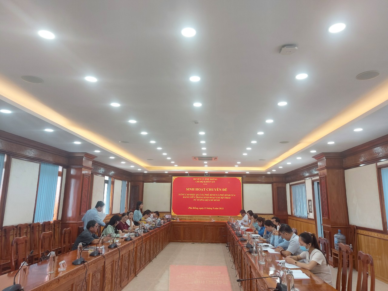Sinh hoạt chi bộ định kỳ là một trong những nội dung cơ bản của công tác xây dựng đảng, là cơ sở cho sự tồn tại và phát triển của đảng và là quy định được ghi rõ trong Điều lệ Đảng. Thời gian quan, Chi bộ Khối vận huyện Phú Riềng là một trong những chi bộ luôn duy trì sinh hoạt định kỳ hàng tháng thường xuyên, đều đặn, thực hiện giải pháp đổi mới nội dung, nâng cao chất lượng sinh hoạt, năng lực của Đảng viên trẻ, đáp ứng yêu cầu lãnh đạo, thực hiện nhiệm vụ chính trị được giao. Cụ thể: Trong đợt sinh hoạt tháng 9/2022 vừa qua, Cấp ủy Chi bộ đã thay đổi triển khai khai nội dung sinh hoạt định kỳ bằng hình thức giao các Đảng viên trẻ nghiên cứu và thực hiện trước tập thể chi bộ. Tham dự đợt sinh hoạt này có Đồng chí (đ/c) Phạm Hồng Công - UV.BTV, Trưởng Ban Dân vận Huyện uỷ, Trưởng Khối vận, đ/c Nguyễn Quang Tích - HUV, Bí thư Chi bộ Khối vận cùng với đông đủ tập thể cấp ủy, lãnh đạo, đảng viên trong chi bộ. Tại buổi sinh hoạt, đ/c Lê Thị Hồng – Đảng viên, Bí thư Chi đoàn Khối vận triển khai các văn bản mới của cấp trên, nêu tóm tắt những nội dung cần được triển khai bằng trình chiếu PowerPoint; đồng thời chiếu phim tư liệu về nội dung tình cảm của Bác Hồ với nông nghiệp, nông dân và nông thôn nhằm tạo không khí mới mẻ, sôi nổi cho buổi sinh hoạt; thông qua đó truyền tải đến đảng viên hiểu hơn về phát triển nông nghiệp và xây dựng nông thôn mới gắn liền với nông dân, sự quan tâm và tình yêu thương sâu sắc của Người đối với nhân dân lao động; từ dó vận dụng tư tưởng, chủ trương, đường lối, chính sách của Người vào thực tiễn. Ngoài ra, Chi bộ đã triển khai sinh hoạt chuyên đề với nội dung “Nâng cao hiệu quả tự phê bình và phê bình của Đảng viên trong sinh hoạt chi bộ theo tư tưởng hồ Chí Minh” do Công đoàn thực hiện; thực hiện sinh hoạt chính trị “Tự soi, tự sửa” đối với 01 cá nhân đảng viên. Qua đó, chỉ ra được những hạn chế, mặt tồn tại, chưa nhìn nhận thẳng thắn khuyết điểm của bản thân của một số cán bộ đảng viên, vẫn còn một số đảng viên có tư tưởng nể ngang, ngại va chạm, không ý kiến phát biểu. Cũng từ đó đề ra giải pháp, nâng cao nhận thức cho cán bộ, đảng viên về tự phê bình và phê bình, hiểu rõ bản chất của tự phê bình và phê bình trong Đảng Cộng sản Việt Nam cũng như sẽ cần xác định được đúng nội dung, lựa chọn đúng nội dung, hình thức và phương pháp để có thể tự phê bình và phê bình theo tư tưởng Hồ Chí Minh. Kết luận tại buổi sinh hoạt, đồng chí Nguyễn Quang Tích - Bí thư chi bộ tiếp thu ý kiến chỉ đạo của phát biểu của đồng chí Phạm Hồng Công – UV.BTV, Trưởng Ban Dân vận Huyện uỷ, phụ trách Khối vận, các ý kiến đóng góp của đảng viên. Đồng thời giao nhiệm vụ cho các đảng viên tiếp tục thực hiện tốt các nhóm nhiệm vụ, giải pháp trọng tâm do cấp ủy Chi bộ đề ra nhằm thực hiện tốt Nghị quyết Trung ương 4 (khóa XII) của Đảng gắn với thực hiện Kết luận số 01-KL/TW ngày 18/5/2021 của Bộ Chính trị về tiếp tục thực hiện Chỉ thị số 05-CT/TW “Về đẩy mạnh học tập và làm theo tư tưởng, đạo đức, phong cách Hồ Chí Minh”, đồng thời các đơn vị đẩy mạnh thực hiện có hiệu quả các chương trình, kế hoạch thực hiện Nghị quyết Đại hội XIII của Đảng và Nghị quyết đại hội Đảng các cấp nhiệm kỳ 2020 - 2025, quyết tâm xây dựng Chi bộ trong sạch, vững mạnh. Thời gian tới, Chi uỷ Chi bộ sẽ tiếp tục đổi mới nội dung, phương thức, chất lượng sinh hoạt; thường xuyên nắm bắt tâm tư, nguyện vọng của cán bộ, đảng viên để kịp thời định hướng. từ đó nâng cao chất lượng hoạt động của các tổ chức Công đoàn, Chi đoàn, năng lực của đảng viên trong chi bộ ngày càng phát triển. Hình ảnh toàn buổi sinh hoạt: Đ/c Nguyễn Quang Tích – HUV, Bí thư Chi bộ quán triệt nội dung sinh hoạt Đ/c Lê Thị Hồng – Bí thư Chi đoàn thay mặt Chi ủy triển khai một số văn bản chỉ đạo của cấp trên Tư liệu phim về Bác Hồ được trình chiếu đến toàn thể cán bộ, đảng viên Đ/c Lưu Thị Phúc - Ủy viên Công đoàn Khối triển khai sinh hoạt chuyên đề Ý kiến đóng góp của Đảng viên trong chi bộ Đ/c Phạm Hồng Công – UV.BTV, Trưởng ban Dân vận Huyện ủy phát biểu chỉ đạo tại cuộc họp