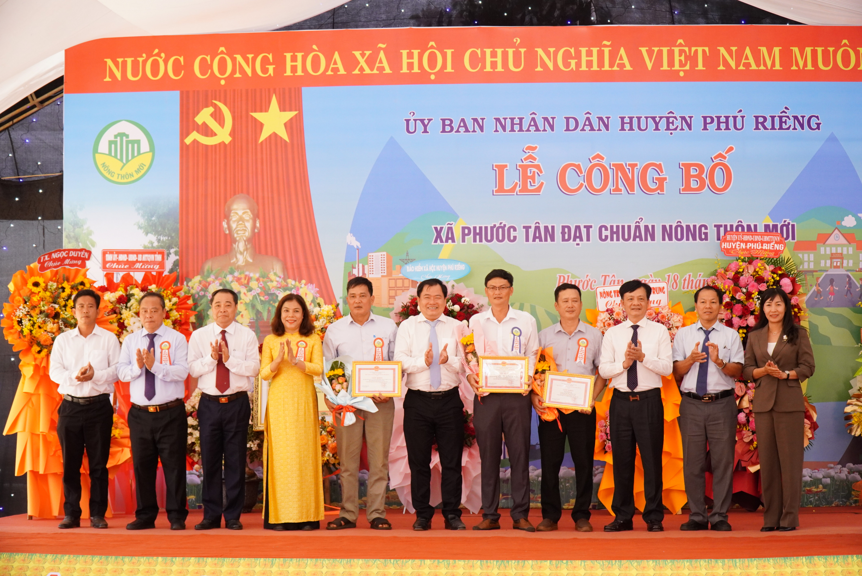 Sáng ngày 18/2/2025, UBND huyện Phú Riềng tổ chức lễ công bố xã Phước Tân đạt chuẩn nông thôn mới (NTM) năm 2023. Phó giám đốc - Phó tổng biên tập Đài phát thanh – Truyền hình và Báo Bình Phước Cao Minh Trực. TUV, Bí thư Huyện ủy Phú Riềng Nguyễn Thị Xuân Hòa; Phó Bí thư Thường trực Huyện ủy, Chủ tịch HĐND huyện Nguyễn Quốc Soài; Phó Bí thư Huyện ủy, Chủ tịch UBND huyện Lê Anh Nam cùng dự. Đầu năm 2023, xã Phước Tân chỉ mới đạt 16/19 tiêu chí nông thôn mới, 3 tiêu chí chưa đạt. Với sự vào cuộc của cả hệ thống chính trị cùng với sự tham gia tích cực của nhân dân, đến nay Phước Tân đã bứt phá vươn lên. Diện mạo nông thôn có nhiều đổi thay, đời sống vật chất tinh thần của nhân dân đã được nâng lên rõ rệt. Đến cuối năm 2023, xã đã đạt chuẩn 19/19 tiêu chí NTM. Tổng vốn xây dựng NTM của xã hơn 33,8 tỷ đồng; trong đó, nhân dân đóng góp gần 4 tỷ đồng. Toàn xã đã hình thành 5 hợp tác xã,1 tổ hợp tác sản xuất nông nghiệp, 2 sản phẩm OCOP hoạt động hiệu quả cao. Thu nhập, mức sống của người dân từng bước được nâng cao, năm 2023 đạt hơn 68 triệu đồng/người. Đến nay, 100% các tuyến đường liên xã được nhựa hóa, bê tông hoá; 100% các tuyến đường trong khu dân cư được bê tông hóa, cứng hoá từ các nguồn vốn của nhà nước và vốn nhân dân đóng góp; tỷ lệ hộ nghèo đa chiều năm 2023 còn 0,38% dân số; 6/6 nhà văn hóa thôn đạt chuẩn theo quy định; tỷ lệ người dân tham gia BHYT đạt 93%... Phát biểu tại lễ công bố, Chủ tịch UBND huyện Lê Anh Nam đề nghị xã Phước Tân tiếp tục quyết tâm giữ vững và nâng chất các tiêu chí, hướng tới xã đạt chuẩn NTM nâng cao. Tập trung huy động lồng ghép các nguồn lực vào xây dựng NTM, phát huy thế mạnh của địa phương; đẩy mạnh công tác tuyên truyền, vận động nhân dân chung tay, góp sức xây dựng NTM. Chú trọng phát triển sản xuất, đẩy mạnh tái cơ cấu nông nghiệp, phát huy thế mạnh, tiềm năng về nông nghiệp, phát triển các loại cây trồng phù hợp với thổ nhưỡng, trong đó cây ăn trái có giá trị kinh tế cao; xây dựng vùng nguyên liệu, thương hiệu, mã số vùng trồng đưa sản phẩm của địa phương ra thị trường trong và ngoài nước. Dịp này, nhiều tập thể, cá nhân được UBND tỉnh, huyện Phú Riềng và xã Phước Tân tặng bằng khen, giấy khen, vì có thành tích trong công tác xây dựng NTM ở địa phương. Xã Phước Tân đón bằng công nhận đạt chuẩn nông thôn mới năm 2023.Xã Phước Tân nhận hoa chúc mừng từ Tỉnh ủy, HĐND, UBND, UBMTTQVN tỉnhUBND huyện Phú Riềng khen thưởng 1 tập thể, 2 cá nhân xuất sắc trong phong trào xây dựng nông thôn mới của xã Phước Tân.