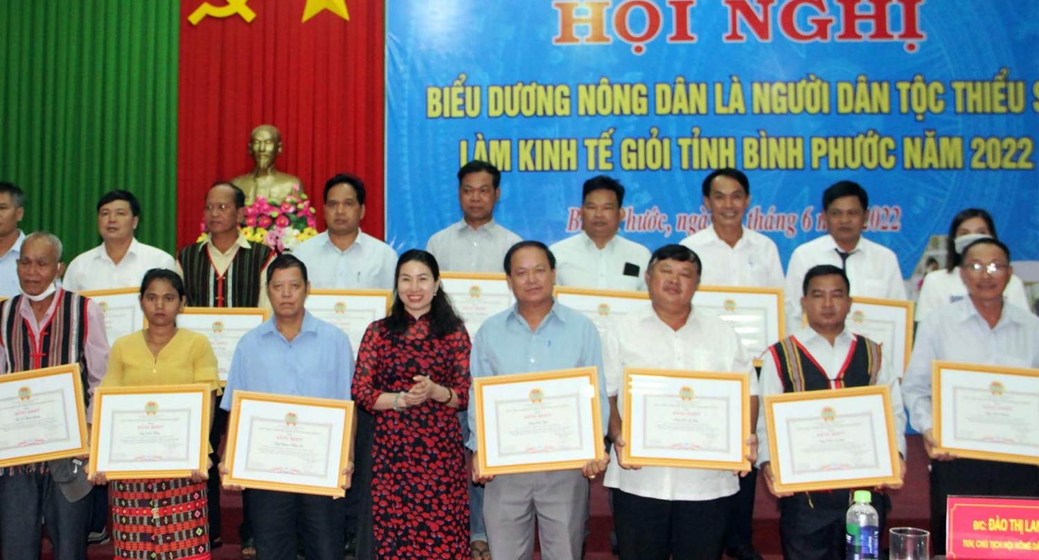 Vừa qua, Hội Nông dân và Ban Dân tộc tỉnh phối hợp tổ chức hội nghị biểu dương nông dân là người dân tộc thiểu số làm kinh tế giỏi của tỉnh Bình Phước năm 2022. Toàn tỉnh hiện có trên 91.000 hội viên, trong đó 20.047 hội viên là đồng bào dân tộc thiểu số (DTTS). Bình quân mỗi năm có trên 47.860 lượt hộ đăng ký tham gia phong trào nông dân sản xuất, kinh doanh giỏi, qua bình xét mỗi năm có gần 28.220 hộ đạt danh hiệu nông dân, sản xuất kinh doanh giỏi các cấp. Toàn tỉnh có 2.455 hộ nông dân sản xuất, kinh doanh giỏi là người DTTS. Huyện Phú Riềng có 20 HTX, 20 tổ hợp tác xã, trong đó có 18 HTX nông nghiệp, 2 HTX thương mại dịch vụ, tổng số vốn đăng ký hoạt động của các HTX là 186 tỷ đồng, diện tích đất canh tác 1.422ha. Trong đó mô hình kinh tế tập thể do hội viên nông dân là người đồng bào DTTS tham gia. Tiêu biểu HTX bơ sáp cao cấp Mã Dưỡng cung cấp cho thị trường khoảng 3.000 tấn/năm, được đánh giá cao về chất lượng; HTX Hồng Nịp của ông Lầu Sỹ Nịp ở xã Long Bình, huyện Phú Riềng hàng năm cung ứng ra thị trường hơn 2.000 tấn bưởi da xanh và sầu riêng chất lượng cao, đạt tiêu chuẩn VietGap. Tại hội nghị đã tuyên dương 60 nông dân là người DTTS có thành tích xuất sắc trong phong trào thi đua “Hội viên nông dân vùng đồng bào dân tộc thiểu số làm kinh tế giỏi” giai đoạn 2017-2021. Trong đó, huyện Phú Riềng có 4 nông dân người đồng bào DTTS được tuyên dương: Lầu Sỹ Nịp (xã Long Bình), Trần A Sám (Phước Tân), Điểu Xlay (Long Tân) và Điểu Chính (Phú Riềng). Ông Trần A Sám, ông Điểu Chính và ông Lầu Sỹ Nịp thứ tự từ phải sang nhận bằng khen tại buổi tuyên dương TUV, Chủ tịch HND tỉnh Đào Thị Lanh trao bằng khen cho nông dân huyện Phú Riềng