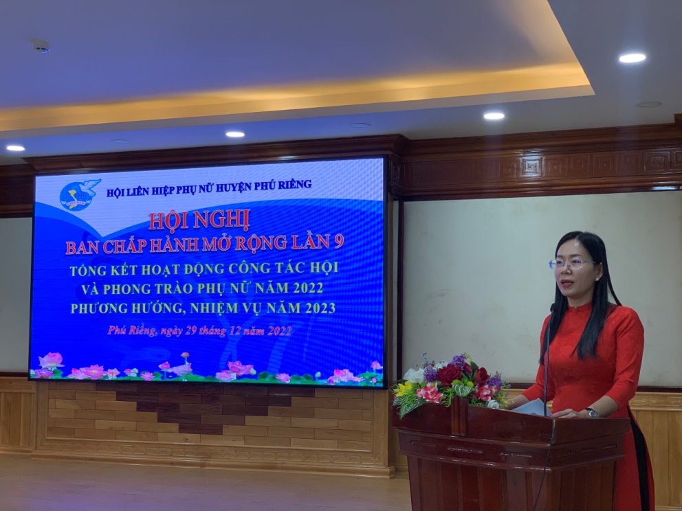 Chiều ngày 29/12/2022, Hội LHPN huyện Phú Riềng vừa tổ chức Hội nghị Ban Chấp hành lần thứ 9 (mở rộng), nhiệm kỳ 2021-2026, tổng kết công tác Hội năm 2022 và triển khai nhiệm vụ năm 2023. Tham dự hội nghị có đồng chí: Lê Thị Thanh Loan – TUV, Chủ tịch Hội LHPN tỉnh Bình Phước, đồng chí Trần Mạnh Tuyển – UV.BTV, Trưởng Ban Tổ chức Huyện ủy, Đ/c Nguyễn Thị Hương – HUV, Phó Trưởng Ban Dân vận Huyện ủy, Đ/c Nguyễn Thị Thanh – HUV, Chủ tịch Hội LHPN huyện cùng các đồng chí là Ủy viên Ban Chấp hành Hội LHPN huyện, các đồng chí làUV.BTV Hội LHPN các xã, đại diện tập thể, cá nhân tiêu biểu năm 2022. Năm 2022 với chủ đề “Đổi mới, sáng tạo trong triển khai và tổ chức thực hiện Nghị quyết Đại hội phụ nữ các cấp góp phần thực hiện Nghị quyết Đại hội phụ nữ toàn quốc lần thứ XIII”. Các cấp Hội Phụ nữ từ huyện đến cơ sở đã bám sát chương trình hoạt động của Hội LHPN tỉnh, nhiệm vụ chính trị của huyện, phát huy sức mạnh đoàn kết, tinh thần dân chủ, sáng tạo, tổ chức triển khai thực hiện các phong trào thi đua, cuộc vận động và nhiệm vụ trọng tâm công tác Hội đều đạt và vượt kế hoạch đề ra. Theo đó, các cấp Hội phụ nữ đã có nhiều sáng tạo trong công tác tuyên truyền, vận động, đặc biệt là đã tổ chức các sự kiện, hoạt động, truyền thông ở cấp huyện và cơ sở, tạo dấu ấn tốt, có sức lan tỏa trong cộng đồng như: phong trào “ Người địa phương biết trang thông tin địa phương” với thông điệp “Lan tỏa hình ảnh đẹp, thu hẹp hình ảnh xấu”, cấp phát 1.368 tờ rơi tuyên truyền về phòng chống bạo lực gia đình cho HVPN, phối hợp truyền thông xây dựng gia đình hạnh phúc, nuôi dạy con tốt, phòng tránh xâm hại tình dục ở phụ nữ, trẻ em, tai nạn thương tích với hơn 3000 trẻ em; lồng ghép tuyên truyền phòng chống tội phạm, tệ nạn xã hội và tín dụng đen với hơn 100 chị tham gia. Vận động giúp đỡ thêm 53 hộ gia đình đạt thêm 8 tiêu chí của cuộc vận động “xây dựng gia đình 5 không, 3 sạch”, tặng 1.281 phần quà cho HVPN, trẻ em nghèo, khó khăn với tổng số tiền 245 triệu đồng; thăm, tặng quà 156 tân binh lên đường nhập ngũ với tổng số tiền 86,4 triệu đồng. Xây dựng 03 căn nhà mái ấm tình thương trị giá 290 triệu, tặng 86 thẻ BHYT cho phụ nữ, trẻ em có hoàn cảnh khó khăn với tổng số tiền 43.500.000đ, kết nối, vận động đỡ đầu 12 trẻ em mồ côi với mức tiền hỗ trợ hàng tháng từ 500.000đ - 2.000.000đ, Hội còn duy trì phát triển tốt các nguồn vốn vay qua tổ chức hội: trên 103 tỷ đồng vốn ủy thác Ngân hàng chính sách xã hội huyện tại 46 tổ cho trên 2.200 hộ vay để phát triển kinh tế gia đình; phối hợp với Hội LHPN, tỉnh giải ngân nguồn vốn từ chương trình hỗ trợ phụ nữ giảm nghèo tỉnh Bình Phước đã giải ngân là 1.900.000.000đ cho 147 chị hội viên, giúp khởi sự, khởi nghiệp cho 20 chị phụ nữ phát triển kinh tế với tổng số tiền 151.000.000đ. Từ nguồn vốn đó các hội viên phụ nữ đã đầu tư phát triển kinh tế cho gia đình từng bước xóa đói giảm nghèo, vươn lên làn giàu chính đáng. Toàn cảnh Hội nghị Bên cạnh đó, công tác xây dựng tổ chức Hội cũng được chú trọng, quan tâm, phát động chương trình “Đồng hành cùng chi – tổ phụ nữ”, có nhiều đổi mới về cách thức thu hút, tập hợp hội viên. Công tác giám sát, phản biện xã hội; bảo vệ quyền và lợi ích hợp pháp của phụ nữ và trẻ em gái tiếp tục được tập trung; các cấp Hội có nhiều nỗ lực, thể hiện rõ nét vai trò tham gia xây dựng Đảng, xây dựng chính quyền, tham gia quản lý Nhà nước. Với những đóng góp tích cực trong công tác và phong trào phụ nữ năm 2022. Hội LHPN huyện đã được Hội LHPN tỉnh tặng bằng khen và xếp loại tập thể hoàn thành xuất sắc nhiệm vụ; 11 cá nhân được Trung ương Hội LHPN Việt Nam tặng kỷ niệm chương “Vì sự phát triển của phụ nữ Việt Nam”. Phát biểu chỉ đạo của Đ/c Lê Thị Thanh Loan, TUV, Chủ tịch Hội LHPN tỉnh Bình Phước