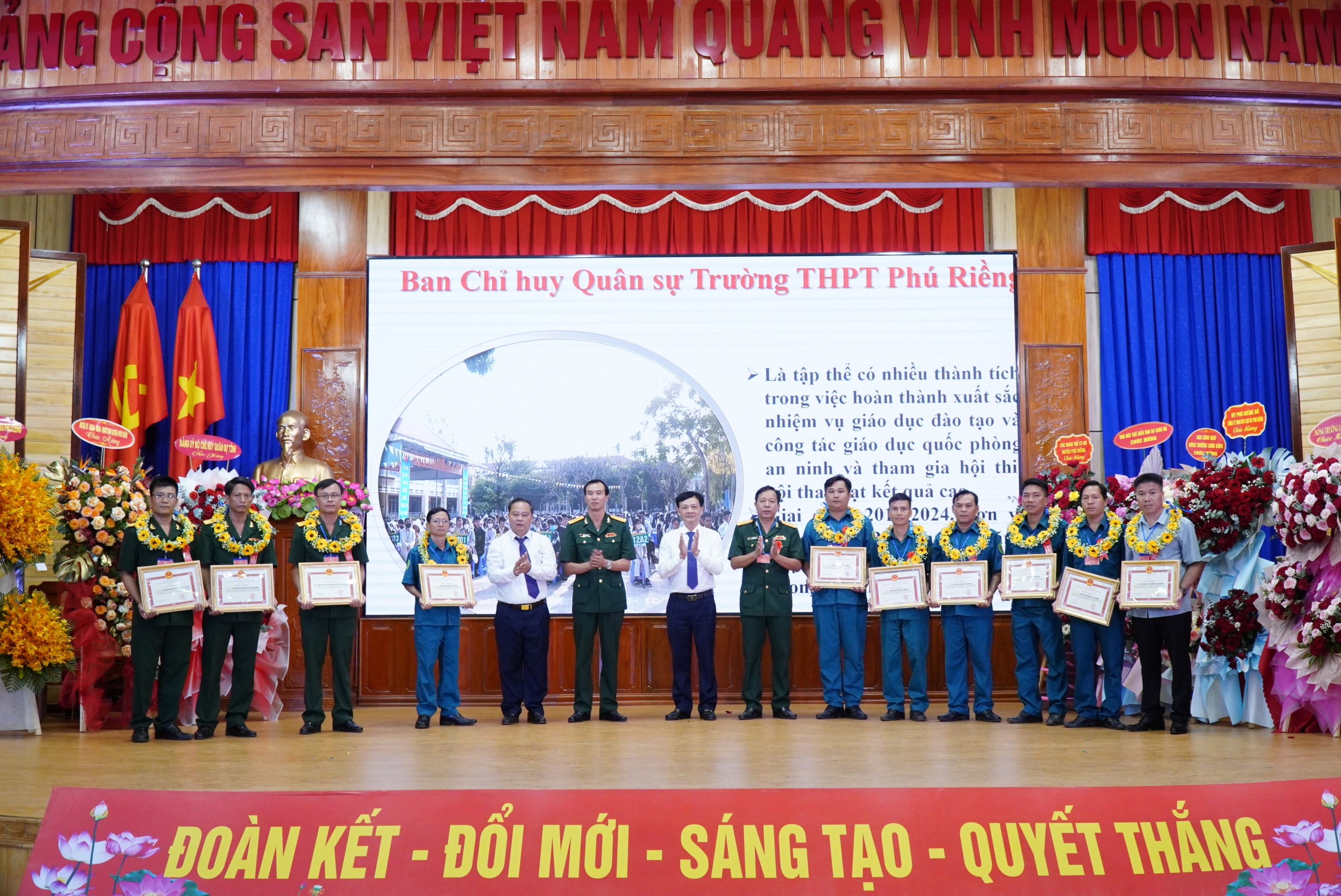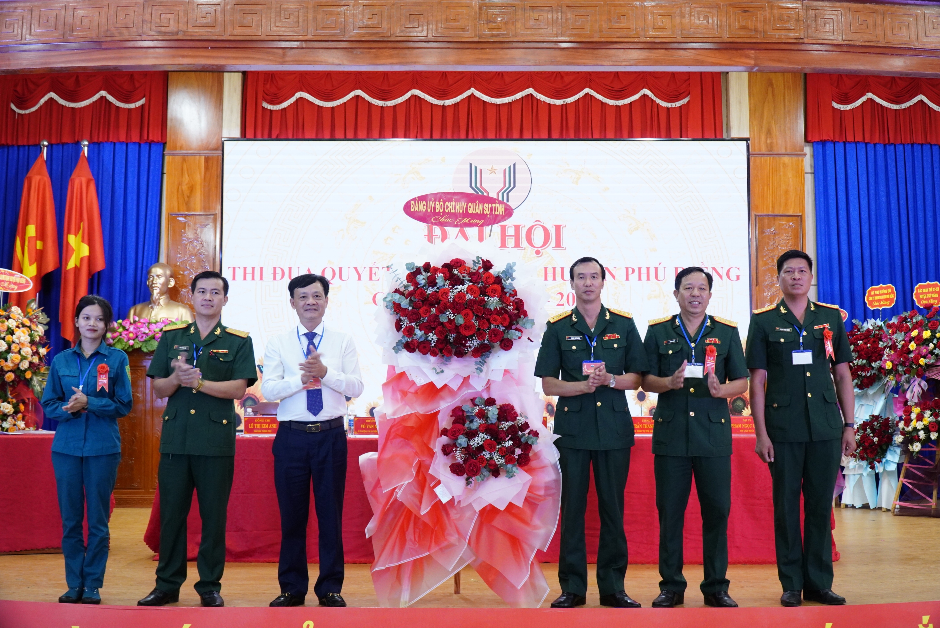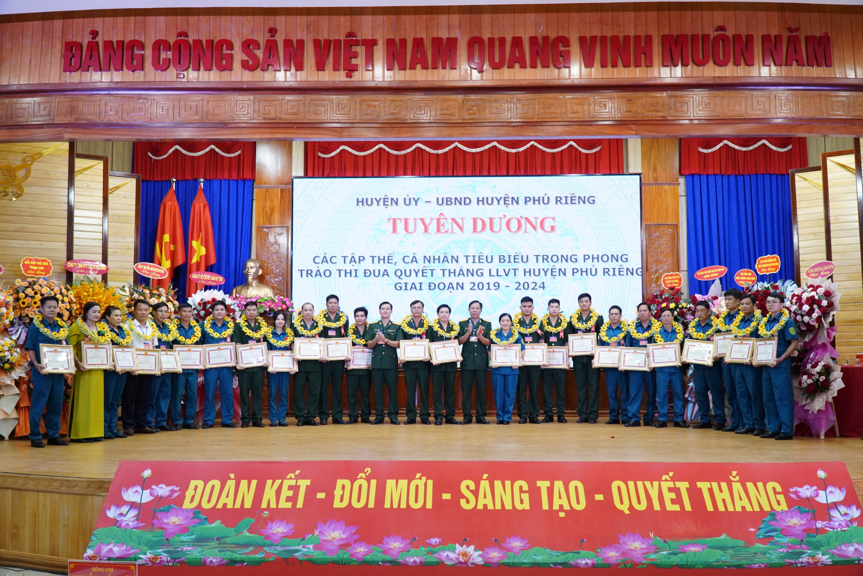 Sáng ngày 24-4, UBND huyện Phú Riềng tổ chức Đại hội thi đua Quyết thắng lực lượng vũ trang (LLVT) huyện Phú Riềng giai đoạn 2019 – 2024. Dự Đại hội có Đại tá Phạm Như Quân, Tỉnh ủy viên, Chính ủy Bộ chỉ huy Quân sự tỉnh Bình Phước; đồng chí Nguyễn Quốc Soài, Phó Bí thư Thường trực Huyện uỷ, Chủ tịch HĐND huyện; đồng chí Lê Anh Nam, Phó Bí thư Huyện uỷ, Chủ tịch UBND huyện. Phong trào thi đua quyết thắng của LLVT huyện Phú Riềng giai đoạn 2019 – 2024 được triển khai đồng bộ với các nội dung, tiêu chí thi đua luôn bám sát nhiệm vụ chính trị của đơn vị, hình thức phát động phong phú, đa dạng tiêu biểu. Thông qua phong trào thi đua quyết thắng đã hình thành và phát triển rộng khắp những điển hình tiên tiến của LLVT huyện, góp phần xây dựng tổ chức đảng, cơ quan, đơn vị vững mạnh toàn diện mẫu mực tiêu biểu. 5 năm qua, Đảng bộ - LLVT huyện đã kết nạp 96 đảng viên mới; 100% cán bộ, chiến sĩ lực lượng thường trực, dân quân tự vệ, dự bị động viênđượcgiáo dục truyền thống, định hướng tư tưởng; kết quả kiểm tra đối tượng sĩ quan, quân nhân chuyên nghiệp tỷ lệ khá, giỏi đạt 100%; dân quân tự vệ, dự bị động viên tỷ lệ khá, giỏi 80%; 100% cán bộ Chỉ huy trưởng và Phó Chỉ huy trưởng Ban CHQS xã qua đào tạo chuyên ngành quân sự cơ sở. Công tác giáo dục quốc phòng và an ninh cho các đối tượng hằng năm đạt 100%; có 67 thí sinh trúng tuyển vào các trường trong quân đội; tổ chức thành công, bảo đảm an toàn tuyệt đối diễn tập khu vực phòng thủ có một phần thực binh của huyện năm 2022 và diễn tập chiến đấu trong khu vực phòng thủ 7/10 xã; xây dựng 7 căn nhà “tình nghĩa quân – dân”; vận động, hỗ trợ hơn 120 tấn rau, củ quả phòng chống dịch covid 19... Phát biểu chỉ đạo Đại hội, Đại tá Phạm Như Quân, Tỉnh ủy viên, Chính ủy Bộ chỉ huy Quân sự tỉnh và đồng chí Nguyễn Quốc Soài, Phó Bí thư Thường trực Huyện uỷ, Chủ tịch HĐND huyệnbiểu dương và ghi nhận những kết quả, thành tích của LLVT huyện đạt được trong giai đoạn qua. Đồng thời đề nghị LLVT huyện tiếp tục tạo chuyển biến sâu sắc, thấy rõ vai trò, vị trí, ý nghĩa, trong nhận thức về công tác thi đua. Phát huy những kết quả đạt được, nhân rộng các mô hình, giải pháp, cách làm hay. Đồng thời, tiếp tục đẩy mạnh việc phát động và triển khai phong trào thi đua với những nội dung, mục tiêu cụ thể, thiết thực; bồi dưỡng, xây dựng nhân cách người quân nhân cách mạng, toàn diện, có tri thức, sức khỏe, năng động, sáng tạo, giàu lòng yêu nước, sống có văn hóa, tình nghĩa… Dịp này, 10 tập thể, 26 cá nhân được Chủ tịch UBND huyện tặng giấy khen vì có thành tích xuất sắc trong phong trào thi đua quyết thắng giai đoạn 2019 – 2024.Đại tá Phạm Như Quân, Chính ủy Bộ chỉ huy Quân sự tỉnh Bình Phước tặng hoa chúc mừng Đại hộiKhen thưởng các tập thể, cá nhân