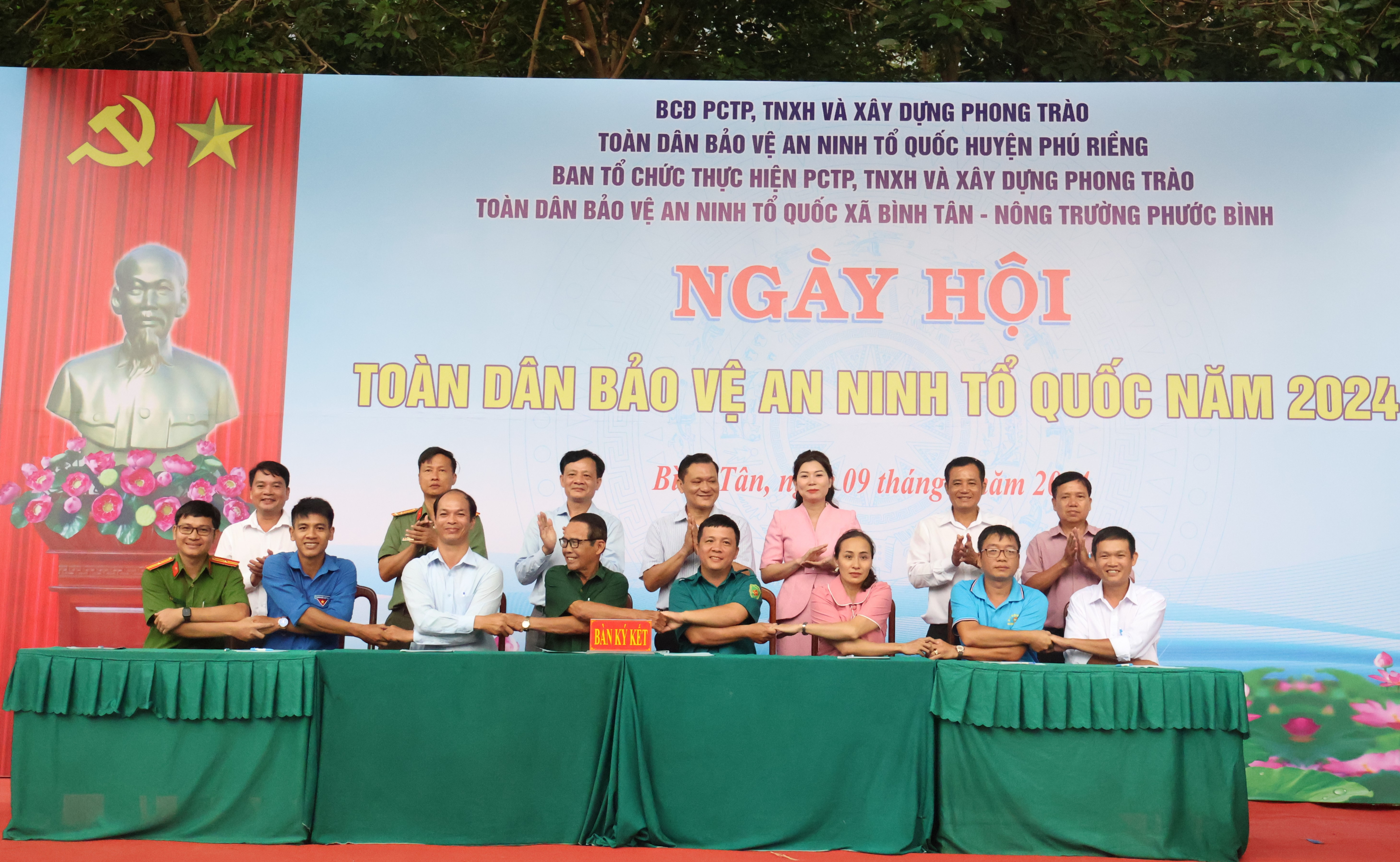 Chiều 9-8, Ban chỉ đạo PCTP, TNXH và xây dựng phong trào toàn dân bảo vệ ANTQ xã Bình Tân phối hợp với Nông trường Phước Bình tổ chức Ngày hội Toàn dân bảo vệ ANTQ năm 2024, đây là đơn vị được chọn làm Ngày hội điểm của huyện Phú Riềng. Phó Bí thư, Chủ tịch UBND huyện Phú Riềng Lê Anh Nam; thượng tá Phạm Nghĩa Trung, Phó Trưởng Công an huyện Phú Riềng, lãnh đạo xã Bình Tân, Nông trường Phước Bình đông đảo bà con nhân dân về dự. Tại Ngày hội, lãnh đạo huyện, Nông trường Phước Bình, cán bộ và nhân dân xã Bình Tân đã cùng tham gia và cổ vũ môn: bóng chuyền, cờ tướng; các trò chơi dân gian: kéo co, nhảy bao bố, đập heo đất, tham quan khu trưng bày các sản phẩm đặc trưng của địa phương và thưởng thức các tiết mục văn nghệ....Tất cả đã tạo nên một ngày hội sôi nổi, vui tươi, ấn tượng và đoàn kết. Báo cáo tại phần Lễ cho thấy, Công an xã Bình Tân và Bảo vệ Nông trường Phước Bình với vai trò là thường trực Ban tổ chức, là lực lượng nòng cốt trong đấu tranh, phòng chống tội phạm, đảm bảo ANTT tại địa phương, đãthường xuyên phối hợp với các tổ chức, hội, đoàn thể trong công tác tuyên truyền pháp luật, nâng cao nhận thức người dân. Vận động cán bộ, Hội viên, đoàn viên, nhân dân và công nhân Nông trường tích cực tham gia PCTP, TNXH, từ đó thúc đẩy phong trào toàn dân bảo vệ ANTQ từng bước phát triển với nhiều nội dung, hình thức, hiệu quả, khơi dậy ý thức trách nhiệm của cả hệ thống chính trị và nhân dân trong công tác đấu tranh phòng chống tội phạm, tệ nạn xã hội, giữ gìn ANTT, xây dựng thôn, xóm, tổ sản xuất an toàn về ANTT. Tình hình tội phạm, tệ nạn xã hội trên địa bàn các năm qua đều được kéo giảm. Xã đã xây dựng và củng cố 21 tổ an ninh nhân dân, 7 tổ hòa giải cơ sở.8 tháng đầu năm quần chúng nhân dân cung cấp cho lực lượng Công an 18 nguồn tin có giá trị. Các tổ hòa giải ở cơ sở đã phối hợp với các ban, ngành xã hòa giải thành công 15 vụ mâu thuẫn trong nhân dân. Tại ngày hội, Công an xã Bình Tân đã tổ chức ký kết giao ước đảm bảo ANTT trên địa bàn xã với Nông trường Phước Bình, Ban chỉ huy Quân sự xã, UB MTTQ, các đoàn thể chính trị và 7 thôn trên địa bàn xã. Bên cạnh đó, Công ty Ngọc Châu cũng trao tặng hội LHPN xã số tiền 30 triệu đồng hỗ trợ phụ nữ có hoàn cảnh khó khăn phát triển kinh tế. Dịp này, 1 tập thể, 2 cá nhân được giám đốc công an tỉnh tặng giấy khen; UBND xã cùng tặng nhiều giấy khen cho các tập thể và cá nhân có thành tích tốt trong phong trào toàn dân bảo vệ ANTQ.Các đại biểu tham dự ngày Hội Toàn dân Bảo vệ An ninh Tổ quốc.Gian hàng trưng bày các sản phẩm đặc trưng của xã Bình Tân tại Ngày hội.Phần hội diễn ra với nhiều nội dung sôi nổi.Chương trình ký kết đảm bảo ANTT tại ngày hội.Các tập thể, cá nhân có thành tích tốt trong phong trào toàn dân bảo vệ ANTQ được Giám đốc Công an tỉnh, UBND xã Bình Tân tặng giấy khen.