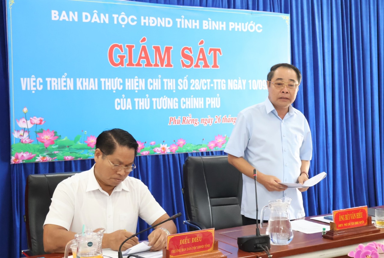 Ngày 26-3, ông Điểu Điều - Trưởng Ban Dân tộc HĐND tỉnh làm Trưởng đoàn đã có buổi giám sát việc triển khai thực hiện Chỉ thị số 28/CT-TTg ngày 10/9/2014 của Thủ tướng Chính phủ về nâng cao hiệu lực, hiệu quả quản lý nhà nước về công tác dân tộc trên địa bàn tỉnh tại huyện Phú Riềng. Tiếp là làm việc với đoàn có ông Bùi Văn Hiếu Phó chủ tịch UBND huyện, cùng lãnh đạo các phòng, ban, đơn vị làm việc với đoàn. Toàn cảnh buổi làm việc.Thời gian qua, huyện Phú Riềng luôn quan tâm, thực hiện các chính sách dân tộc, chương trình mục tiêu quốc gia được triển khai hiệu quả tạo điều kiện cho vùng đồng bào dân tộc thiểu số (DTTS) từng bước phát triển KT-XH. Trong 2 năm: 2023, 2024 Nguồn vốn Chương trình mục tiêu Quốc gia phát triển kinh tế- Xã hội vùng đồng bào dân tộc thiểu số và miền núi được cấp gần 6,7 tỉ đồng, nguồn vốn được phân khai đúng quy định; quyết liệt hỗ trợ tối đa các điều kiện hoàn thiện 160 giấy chứng nhận quyền sử dụng đất cho 158 hộ đồng bào dân tộc thiểu số để thụ hưởng Chương trình 134. Công tác giảm nghèo trong vùng đồng bào dân tộc thiểu số luôn thực hiện vượt chỉ tiêu; chính sách đối với với già làng tiêu biểu và người có uy tín được quan tâm. Hệ thống điện lưới quốc gia, các dịch vụ phát thanh, truyền hình, viễn thông được phủ đến tất cả các khu dân cư có đông đồng bào dân tộc thiểu số sinh sống, tỷ lệ người dân sử dụng điện đạt 99,37%. Huyện đã tổ chức 2 lớp xóa mù chữ và nhiều lớp tập huấn bảo tồn phát huy giá trị văn hóa truyền thống của đồng bào DTTS..... Phó Chủ tịch UBND huyện Bùi Văn Hiếu phát biểu tại buổi giám sát. Sau khi các thành viên tập trung làm rõ thêm về nguồn vốn, công tác triển khai một số văn bản; các thủ tục hành chính liên quan đến đồng bào dân tộc; tiếp cận vốn vay ngân hàng chính sách xã hội...,Trưởng Ban Dân tộc HĐND tỉnh Điểu Điều đánh giá việc triển khai các chính sách dân tộc tại huyện Phú Riềng, đồng chí đề nghị địa phương tiếp thu, hoàn thiện báo cáo, từ những khó khăn đã nêu có giải pháp khắc phục trong thời gian tới.