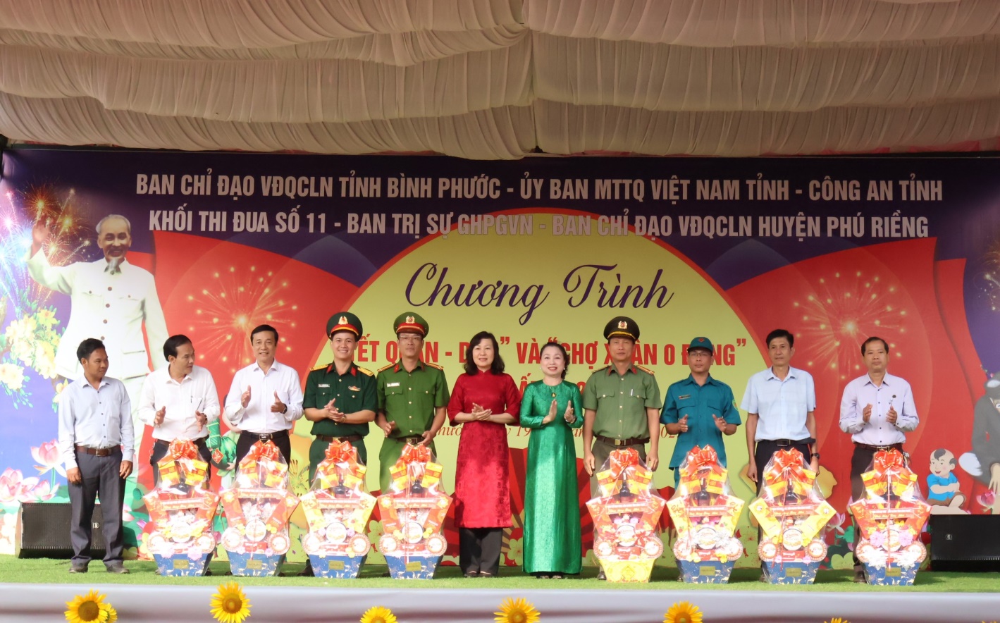 Ngày 20-1, tại xã Long Hà, Ban chỉ đạo Vận động quần chúng liên ngành tỉnh Bình Phước; Ban chỉ đạo Vận động quần chúng liên ngành huyện Phú Riềng tổ chức khai mạc chương trình “Tết Quân - Dân” và “Chợ xuân 0 đồng” Xuân Ất Tỵ năm 2025. Dự chương trình có Phó Bí thư Thường trực Tỉnh ủy, Chủ tịch HĐND tỉnh Huỳnh Thị Hằng; Ủy viên BTV Tỉnh ủy, Trưởng Ban Dân vận Tỉnh ủy Lê Thị Xuân Trang, Trưởng ban Chỉ đạo vận động quần chúng liên ngành tỉnh, lãnh đạo các sở, ban, ngành. Về phía huyện có các đồng chí: Nguyễn Thị Xuân Hoà, Tỉnh uỷ viên, Bí thư Huyện uỷ; Nguyễn Quốc Soài, Phó Bí thư Thường trực Huyện uỷ, Chủ tịch HĐND huyện; Lê Anh Nam, Phó Bí thư Huyện uỷ, Chủ tịch UBND huyện; lãnh đạo các phòng, ban, đơn vị của huyện, xã Long Hà; lực lượng vũ trang, cán bộ, đảng viên trong xã cũng tham dự.Quang cảnh các đại biểu và đông đảo bà con nhân dân dự khai mạc chương trìnhUVBTV Tỉnh ủy, Trưởng Ban Dân vận Tỉnh ủy Lê Thị Xuân Trang, Trưởng ban Chỉ đạo vận động quần chúng liên ngành tỉnh phát biểu khai mạc chương trìnhPhó Bí thư Thường trực Tỉnh ủy, Chủ tịch HĐND tỉnh Huỳnh Thị Hằng và Trưởng Ban Dân vận Tỉnh ủy Lê Thị Xuân Trang trao quà tết cho các hộ dân.Tỉnh ủy viên, Bí thư huyện ủy Phú Riềng Nguyễn Thị Xuân Hòa trao quà tết cho các hộ dân Chương trình đã trao tặng 30 phần quà gồm bánh kẹo và các nhu yếu phẩm cho các gia đình chính sách, hộ nghèo, hộ cận nghèo, hộ đồng bào dân tộc ít người có hoàn cảnh đặc biệt khó khăn, đối tượng bảo trợ xã hội và trao 370 phần tại gian hàng “0 đồng”. Phát biểu tại lễ khai mạc, Trưởng Ban dân vận tỉnh ủy, Lê Thị Xuân Trang cho biết: Tết dân quân và Chợ 0 đồng là hoạt động thiết thực có ý nghĩa nhân văn sâu sắc, thể hiện đạo lý “Uống nước nhớ nguồn, “Đền ơn đáp nghĩa” và phong trào cả nước chung tay vì người nghèo, không để ai bị bỏ lại phía sau. Đó là truyền thống đoàn kết tương thân, tương ái của dân tộc ta và là bản chất truyền thống tốt đẹp của “Bộ đội Cụ Hồ”. Đồng thời đây cũng là dịp các cấp, ngành, các địa phương chung tay chăm lo tết cho gia đình chính sách, đồng bào nghèo, địa phương khó khăn vui xuân đón tết. Dịp này, Ban Chỉ đạo vận động quần chúng liên ngành tỉnh đã trao thư cảm ơn các nhà tài trợ của chương trình; Ban Chỉ đạo vận động quần chúng liên ngành huyện Phú Riềng cũng trao giải cuộc thi gói bánh chưng, bánh tét và trại đẹp.