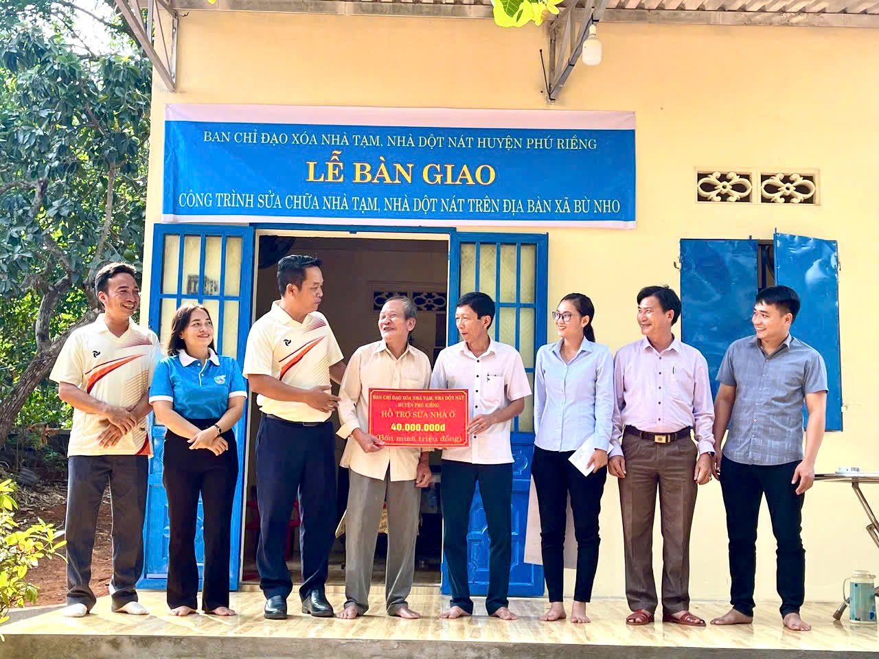 Hưởng ứng phong trào thi đua “Chung tay xóa nhà tạm, nhà dột nát trên phạm vi của nước trong năm 2025” do Thủ tướng Chính phủ phát động và lời kết gọi của Đoàn chủ tịch ủy ban Trung ương MTTQ VN với thông điệp “Triệu tấm lòng yêu thương- Nghìn mái nhà hạnh phúc”, trung tuần tháng 2/2025 Huyện ủy- HĐND- UBND- UB MTTQ VN huyện Phú Riềng tổ chức Lễ phát động phong trào thi đua toàn huyện “Chung tay xóa nhà tạm, nhà dột nát”, đến nay tiến độ triển khai đang được đảm bảo. Theo kết quả thẩm tra của Ủy ban MTTQVN tỉnh và Đoàn kiểm tra của huyện đối với số hộ nghèo, hộ cận nghèo đề nghị cấp nhà theo chương trình xóa nhà tạm, nhà dột nát trên địa bàn huyện Phú Riềng. Toàn huyện có 37 hộ đề nghị hỗ trợ xóa nhà tạm, nhà dột nát, trong đó, 11 hộ là người có công với cách mạng, 26 hộ nghèo, cận nghèo. Sau hơn 1 tháng phát động phong trào xóa nhà tạm, nhà dột nát trên địa bàn huyện Phú Riềng. Đến nay, 11/11 căn nhà người có công đều đã khởi công xây dựng, hoàn thiện sửa chữa 6 căn; 6 căn còn lại đang thực hiện xây dựng và sửa chữa, dự kiến trong tháng 5/2025 sẽ hoàn thành, đưa vào sử dụng cả 11 căn. Đối với các hộ nghèo, cận nghèo, đã khởi công xây dựng và sửa chữa nhà ở cho 19/26 hộ (trong đó, xây dựng 9 căn; sửa chữa 10 căn); dự kiến trước 31/3/2025 sẽ khởi công thực hiện tiếp 5 căn (còn lại 2 hộ không thực hiện vì 1 hộ chuyển đi nơi khác sinh sống; 1 hộ hiện tại không còn nhu cầu). Xác định công tác xóa nhà tạm, nhà dột nát là một nhiệm vụ quan trọng, góp phần đảm bảo an sinh xã hội, giúp các hộ dân khó khăn có chỗ ở ổn định, yên tâm lao động sản xuất, thời gian qua, cả hệ thống chính trị huyện Phú Riềng cùng vào cuộc, Ban chỉ đạo từ huyện tới xã thường xuyên đôn đốc; công tác kiểm tra, rà soát được thực hiện liên tục. Nhờ làm tốt công tác tuyên truyền, vận động, nhiều tổ chức, cá nhân đã cùng chung tay hỗ trợ tiền mặt, vật tư, ngày công lao động, đồ dùng, nội thất, giúp các gia đình có được chỗ ở khang trang, tiện nghi hơn. Ban chỉ đọa xóa nhà tạm, nhà dột nát xã Long Hà khởi công sửa chữa nhà cho người có công với cách mạng.Ban chỉ đạo xóa nhà tạm, nhà dột nát xã Bù Nho bàn giao công trình sửa chữa nhà cho người có công.