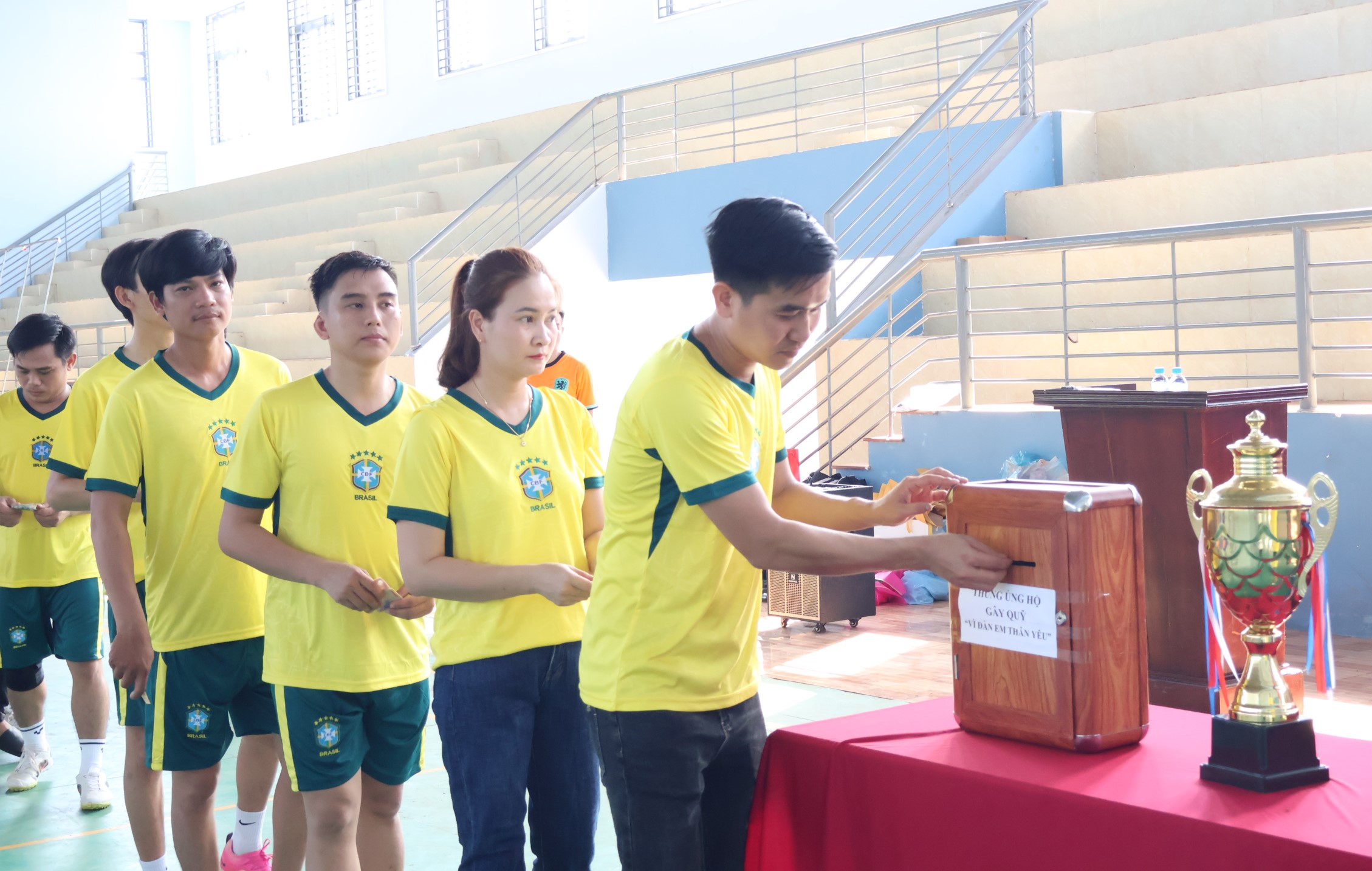 Sáng 25-5, Công đoàn- Đoàn Thanh niên Phòng Tài nguyên và Môi trường, Chi nhánh Văn phòng Đăng ký Đất đai huyện đã tổ chức giao lưu thể dục thể thao, gây quỹ từ thiện “Vì đàn em thân yêu”. Bí thư Chi bộ, trưởng Phòng Tài nguyên và Môi trường Nguyễn Danh Tùng; Giám đốc Chi nhánh Văn phòng Đăng ký Đất đai huyện Phú Riềng Lê Tiến Lâm cùng đông đảo cán bộ, công chức, viên chức, người lao động của 2 đơn vị cùng tham gia. Tại đây, 2 đơn vị đã thành lập 3 đội bóng nam với khoảng 50 vận động viên thi đấu trên tinh thần giao lưu, học hỏi, thắt chặt tình đoàn kết, các đội bóng thi đấu dưới sự cỗ vũ nhiệt tình của các cổ động viên. Đặc biệt, trong khuôn khổ chương trình, đã diễn ra hoạt động quyên góp, gây quỹ từ thiện “Vì đàn em thân yêu” và nhận được sự hưởng ứng nhiệt tình của lãnh đạo, công chức, viên chức, người lao động 2 đơn vị. Theo đó, mỗi người đã ủng hộ tối thiểu 1 ngày lương . Với phương châm “Nhường cơm, sẻ áo”, “Lá lành đùm lá rách”, hoạt động trên được Công đoàn- Đoàn Thanh niên Phòng Tài nguyên và Môi trường, Chi nhánh Văn phòng Đăng ký Đất đai huyện Phú Riềng duy trì hàng năm, với mong muốn giúp đỡ được nhiều hoàn cảnh khó khăn trong cuộc sống. Riêng năm 2023, đơn vị đã quyên góp được số tiền trên 70 triệu đồng, phối hợp với các trường học trên địa bàn huyện tiếp sức cho các em học sinh nghèo hiếu học và hỗ trợ trang thiết bị cho các trường học còn khó khăn. Đông đảo cán bộ, công chức, viên chức, người lao động của 2 đơn vị cùng tham gia.Cán bộ, công chức, viên chức, người lao động của 2 đơn vị nhiệt tình hưởng ứng gây quỹ từ thiện “Vì đàn em thân yêu”.