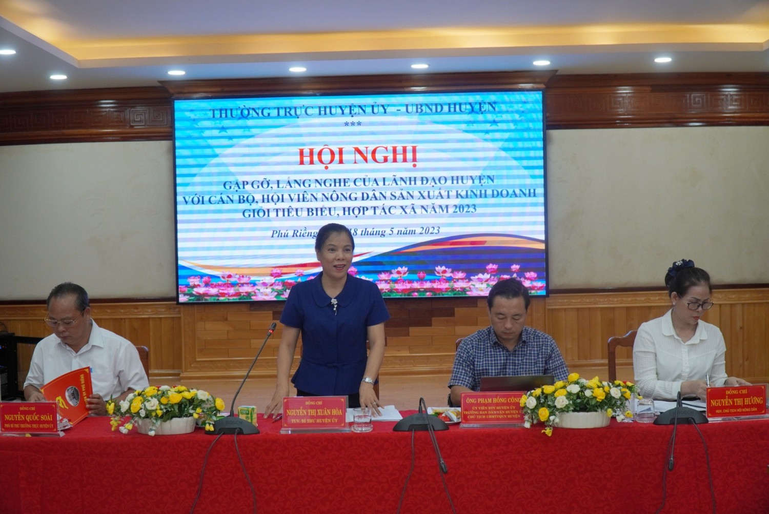Vừa qua, Tỉnh ủy viên, Bí thư Huyện ủy Phú Riềng Nguyễn Thị Xuân Hòa và Phó Bí thư Thường trực Huyện ủy, Chủ tịch HĐND huyện Nguyễn Quốc Soài đồng chủ trì hội nghị gặp gỡ, đối thoại giữa lãnh đạo huyện với cán bộ, hội viên nông dân sản xuất kinh doanh giỏi (SXKDG) tiêu biểu, hợp tác xã (HTX) năm 2023. Đồng chí Phạm Hồng Công, UV.BTV, Trưởng ban Dân vận, Chủ tịch UBMTTQ Việt Nam huyện cùng dự. Trong thời gian qua, tình hình đời sống của nông dân tương đối ổn định, tin tưởng vào sự lãnh đạo của Đảng, sự quản lý điều hành của các cấp chính quyền. Phong trào nông dân thi đua SXKDG, đoàn kết giúp nhau làm giàu và giảm nghèo bền vững đã lan tỏa sâu rộng trên địa bàn huyện. Các tổ hợp tác, hợp tác xã đã phát huy vai trò rất lớn trong việc vận động nông dân tham gia chia sẻ kinh nghiệm, kỹ thuật cùng nhau vươn lên, phát triển. Tại hội nghị, các đại biểu đã nêu lên những khó khăn vướng mắc và có các ý kiến, kiến nghị về các vấn đề: Huyện có giải pháp khắc phục, hỗ trợ nông dân giải quyết vấn đề cây điều mất mùa do thời tiết bất thường, giá cả bấp bênh không ổn định; huyện cần thành lập một hợp tác xã chuyên về cung cấp giống cây điều, đảm bảo chất lượng và chuyển giao khoa học kỹ thuật; hợp tác xã có được miễn, giảm thuế môn bài hay không; khó khăn trong tiếp cận nguồn vốn vay phát triển sản xuất; quản lý chất lượng cây giống, phân bón, thuốc bảo vệ thực vật; đầu tư nâng cấp, xây dựng hệ thống đường giao thông nông thôn, kéo điện phục vụ sản xuất, tạo thuận lợi cho nông dân vận chuyển, tiêu thụ nông sản; ứng dụng công nghệ thông tin, công tác tuyên truyền nâng cao nhận thức nông dân tham gia vào hợp tác xã; hỗ trợ phát triển sản phẩm OCOP… Kết luận hội nghị, Bí thư Huyện ủy Phú Riềng Nguyễn Thị Xuân Hòa yêu cầu: Hội nông dân cần phối hợp các phòng, ban, đơn vị liên quan cần có những buổi đối thoại chuyên đề để tìm giải pháp, tháo gỡ khó khăn cho nông dân, HTX. UBND huyện có Nghị quyết trong lãnh đạo, chỉ đạo có lộ trình phát triển các HTX, các sản phẩm OCOP gắn với huyện đích NTM. Phòng Nông nghiệp phối hợp chặt chẽ các ngành, địa phương tăng cường kiểm tra giám sát chặt chẽ tình hình sản xuất cây con giống, phân bón, thuốc bảo bảo vệ thực vật trên địa bàn huyện nhằm đảm bảo chất lượng cung cấp cho nông dân; hỗ trợ các cơ sở, doanh nghiệp xây dựng thương hiệu sản phẩm, tham gia các thị trường tiêu thụ sản phẩm; hướng dẫn các bước thực hiện đăng ký và thủ tục xây dựng HTX, các sản phẩm tham gia chương trình mỗi xã một sản phẩm OCOP theo quy định; hướng dẫn hỗ trợ liên kết sản xuất. Trung tâm Dịch vụ nông nghiệp huyện tăng cường công tác nghiên cứu, ứng dụng chuyển giao tiến bộ kỹ thuật mới, nhất là ứng dụng công nghệ cao vào sản xuất nông nghiệp. Mở các lớp tập huấn cho nông dân hướng dẫn kỹ thuật trồng trọt và chăn nuôi về các sản phẩm chủ lực ngành nông nghiệp huyện. Đề nghị các ngân hàng trên địa bàn huyện tiếp tục hỗ trợ, hướng dẫn nông dân, các doanh nghiệp hoạt động, sản xuất kinh doanh trong lĩnh vực nông nghiệp được tiếp cận nguồn vốn vay ưu đãi phục vụ sản xuất kinh doanh; Dịp này, 5 cá nhân được UBND huyện tặng giấy khen trong phong trào nông dân sản xuất kinh doanh giỏi năm 2022. Thường trực Huyện ủy chủ trì hội nghị Toàn cảnh hội nghị