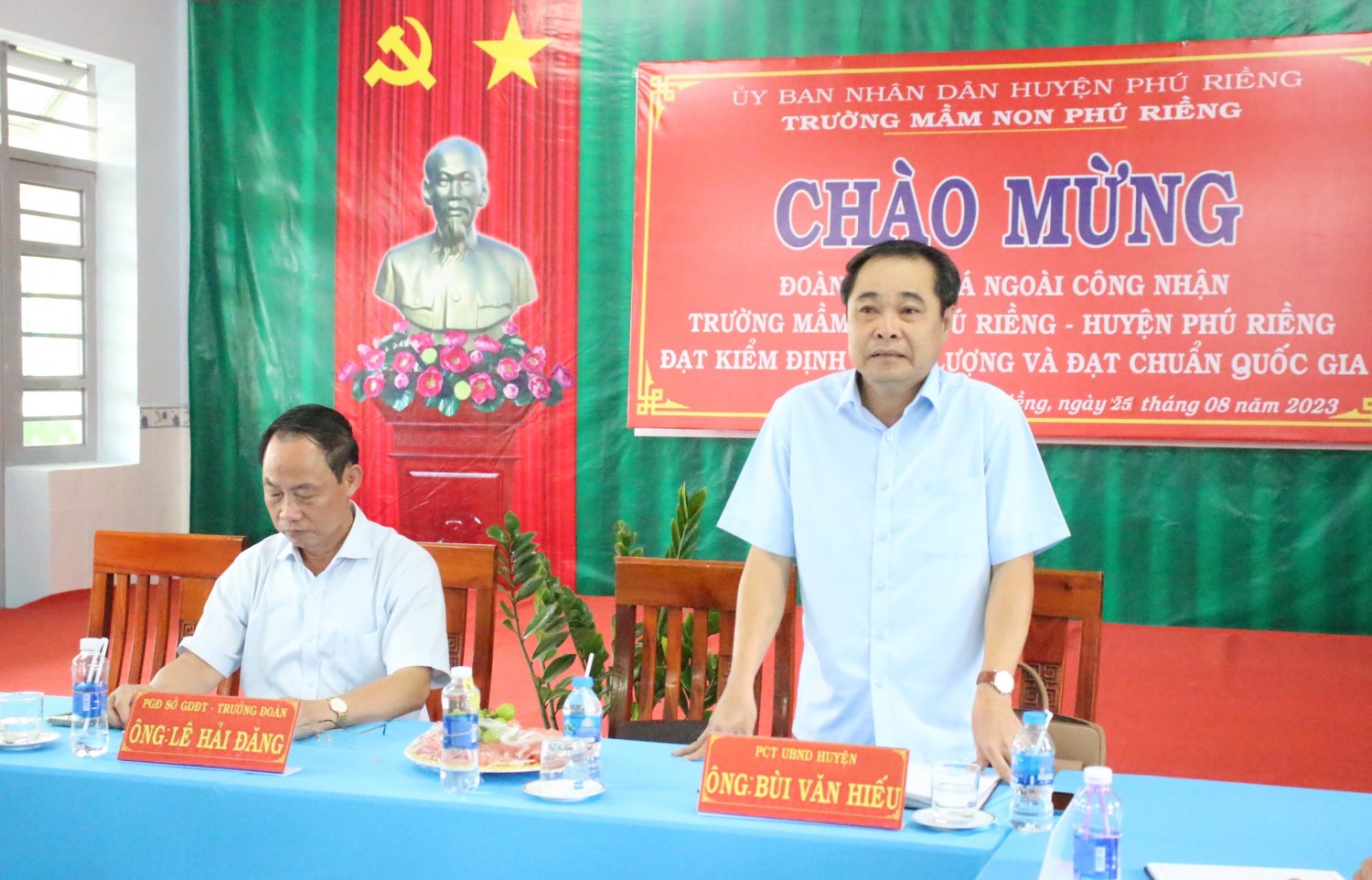 Sáng 25-8, trường Mầm non Phú Riềng đã đón đoàn đánh giá ngoài của Sở GD&ĐT do ông Lê Hải Đăng, Phó Giám đốc Sở làm trưởng đoàn về kiểm tra công tác kiểm định chất lượng và trường đạt chuẩn Quốc gia. UV BTV, Phó Chủ tịch UBND huyện Bùi Văn Hiếu cùng lãnh đạo các phòng, ban, đơn vị tiếp và làm việc với đoàn. Từ khi thành lập tới nay, trường Mầm non Phú Riềng đã có những bước phát triển vượt bậc về mọi mặt; Các mặt hoạt động phát triển ổn định, bền vững, khẳng định được vị thế của nhà trường đối với bậc học mầm non. Tập thể nhà trường luôn đoàn kết, nhiệt tình, sáng tạo, hoàn thành tốt mọi nhiệm vụ được giao. Nhiều năm liền trường đạt thành tích xuất sắc, được các cấp công nhận và tặng thưởng bằng khen, giấy khen. Qua quá trình kiểm tra, đoàn đánh giá: nhà trường đã chuẩn bị cơ bản đầy đủ các minh chứng và các tài liệu liên quan, cơ sở vật chất trường lớp khang trang, xanh- sạch- đẹp, phòng học được trang bị đầy đủ đồ dùng đạt theo tiêu chuẩn Quốc gia về yêu cầu thiết kế trường mầm non. Phó Giám đốc Sở GD&ĐT Lê Hải Đăng ghi nhận, đánh giá cao những nỗ lực của tập thể cán bộ, giáo viên, nhân viên nhà trường, đặc biệt là công tác tham mưu cho cấp ủy, chính quyền địa phương trong việc xây dựng trường chuẩn, phấn đấu xây dựng trường học có chất lượng giáo dục ngày càng cao, tạo niềm tin đối với cha mẹ học sinh. Đề nghị nhà trường tiếp tục phát huy những điểm mạnh, những hiệu quả đã đạt được về chất lượng chăm sóc, giáo dục trẻ. Đồng thời, hanh chóng khắc phục những hạn chế mà đoàn đã chỉ ra, kiện toàn, nâng cao chất lượng các tiêu chí, tiêu chuẩn kiểm định chất lượng giáo dục. Hoàn thiện hồ sơ trong ngày 27-8-2023 báo cáo Sở GD&ĐT để tiến hành các bước và trình UBND tỉnh xem xét, công nhận trường đạt chuẩn Quốc gia. Ông Lê Hải Đăng, Phó Giám đốc Sở GD&ĐT phát biểu chỉ đạo tại buổi đánh giá. UV BTV, Phó Chủ tịch UBND huyện Phú Riềng Bùi Văn Hiếu phát biểu tại buổi đánh giá.