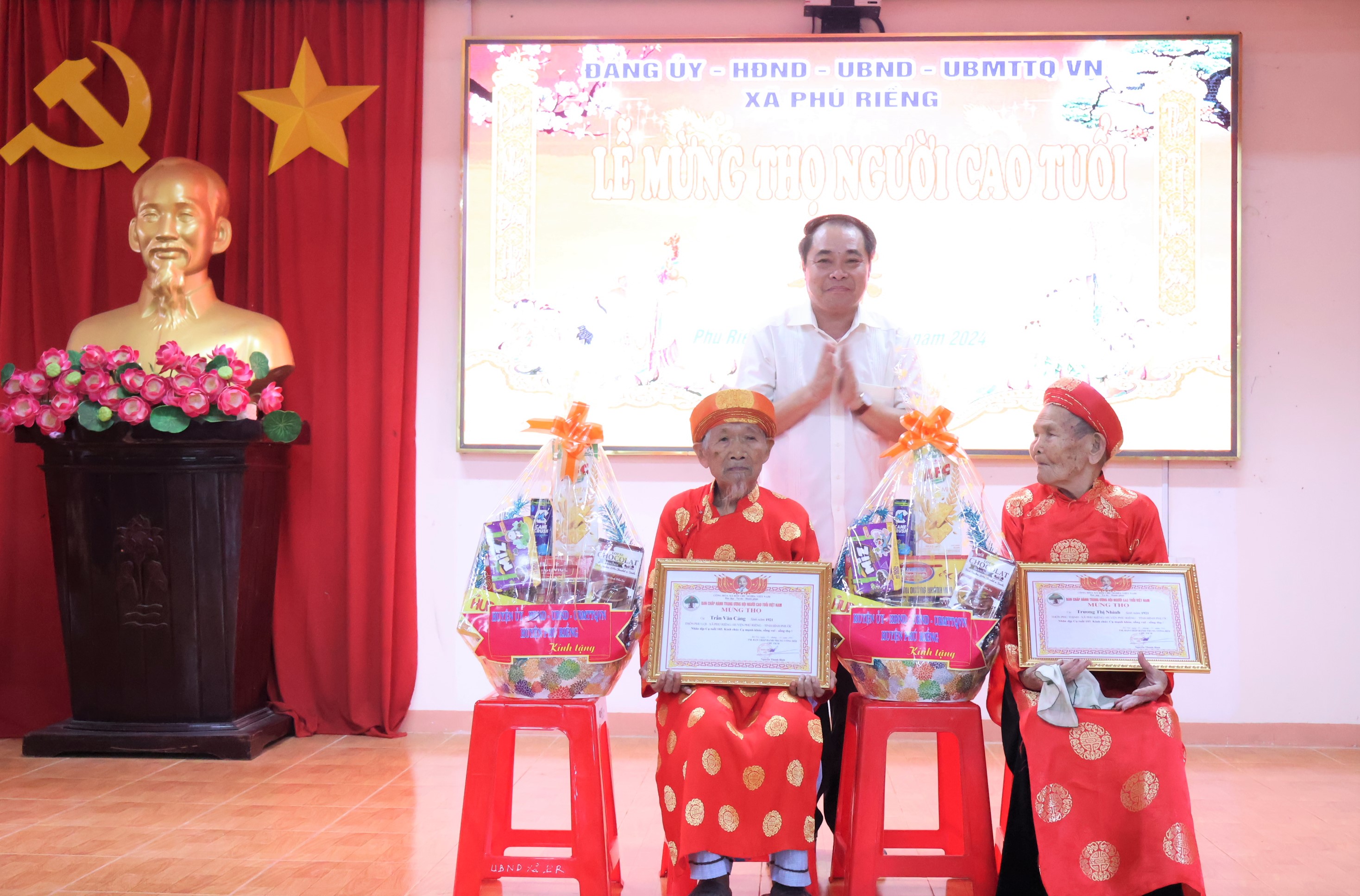 Sáng 1-10, xã Phú Riềng đã tổ chức Lễ mừng thọ người cao tuổi năm 2024. UV BTV, Phó Chủ tịch UBND huyện Phú Riềng Bùi Văn Hiếu, Chủ tịch Hội người cao tuổi huyện Trương Minh Dũng cùng về dự.Chúc thọ các cụ người cao tuổi xã Phú Riềng. Lễ mừng thọ là hoạt động ý nghĩa nhằm quan tâm chăm sóc người cao tuổi, là nét đẹp trong đời sống văn hóa tinh thần, tô thắm truyền thống đạo lý nhân văn của dân tộc, thể hiện sự tôn trọng của xã hội với người cao tuổi, tấm lòng hiếu thảo của con, cháu với ông bà, cha mẹ. Dịp này, xã Phú Riềng có 210 cụ tròn 70, 75, 80, 85, 90, 95 và trên 100 tuổi được chúc thọ, mừng thọ. Những ngày qua, nhiều đoàn công tác từ tỉnh, huyện, xã, thôn đã đi thăm, tặng quà các cụ. Đây là những việc làm thiết thực nhằm khẳng định vai trò, vị thế của người cao tuổi đối với gia đình và xã hội, giúp người cao tuổi sống vui, sống khỏe, sống có ích, xứng đáng với 18 chữ vàng mà Đảng và Nhà nước trao tặng “Tuổi cao chí càng cao, nêu gương sáng vì sự nghiệp xây dựng và bảo vệ Tổ quốc”. UV BTV, Phó Chủ tịch UBND huyện Phú Riềng Bùi Văn Hiếu phát biểu chúc thọ. Tại buổi lễ, đồng chí Bùi Văn Hiếu, UV BTV, Phó Chủ tịch UBND huyện Phú Riềng chúc thọ các cụ, đồng thời khẳng định trong những năm qua, công tác chăm sóc về mặt tinh thần, vật chất và sức khỏe người cao tuổi của huyện Phú Riềng nói chung và xã Phú Riềng nói riêng luôn được cấp ủy, chính quyền, cộng đồng xã hội quan tâm và thực hiện có hiệu quả, các cụ luôn là tấm gương sáng cho con cháu noi theo, tích cực tuyên truyền tốt các đường lối chủ trương của Đảng, chính sách pháp luật của Nhà nước. qua đây, đồng chí cũng đề nghị địa phương tiếp tục có nhiều hoạt động chăm lo đời sống người cao tuổi, con cháu trong gia đình tiếp tục hiếu thảo, hòa thuận, yêu thương để các cụ có đời sống vui, khỏe.