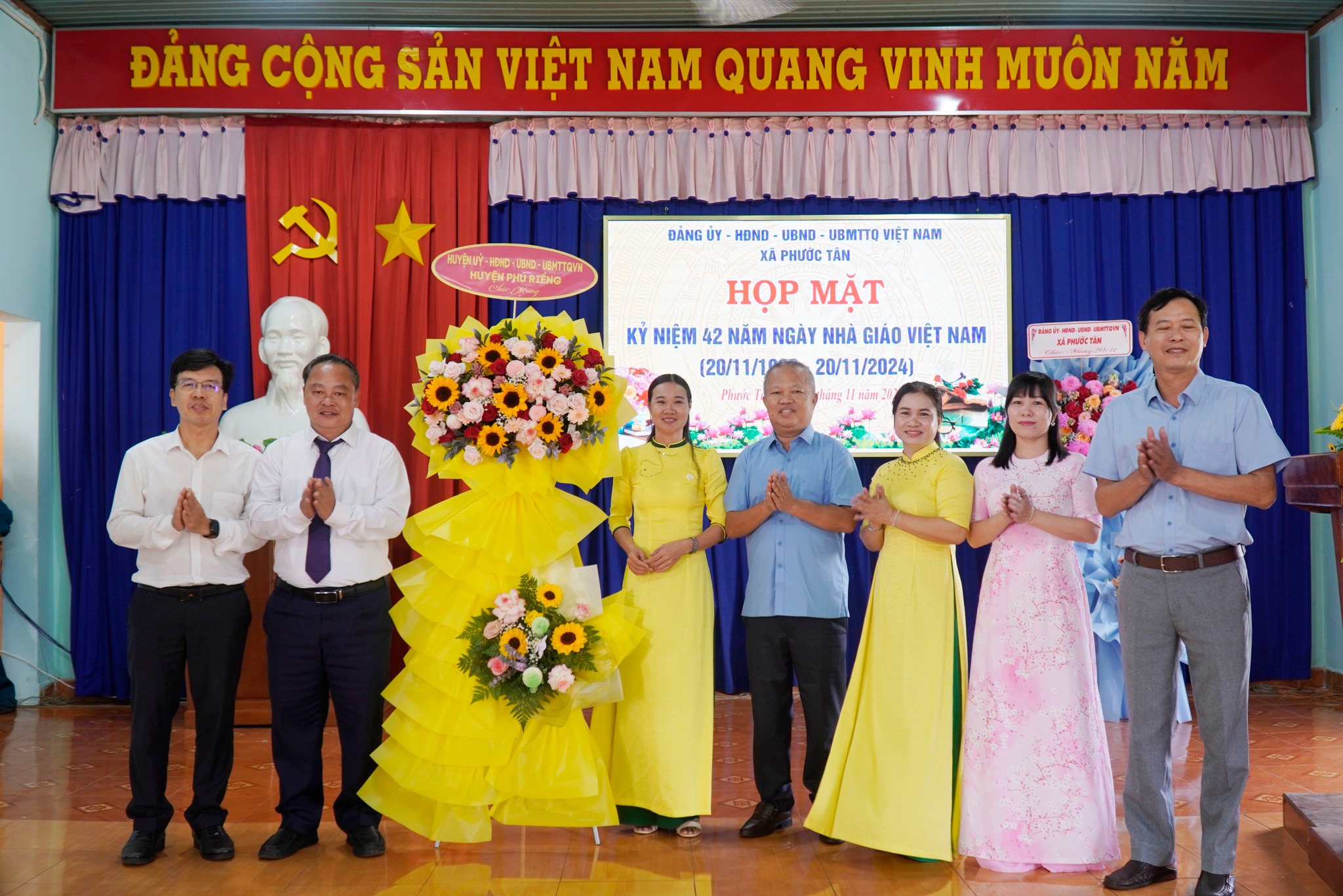 Ngày 20-11, Đảng ủy-HĐND-UBND-Ủy ban MTTQVN xã Phước Tân tổ chức họp mặt kỷ niệm 42 năm Ngày Nhà giáo Việt Nam (20/11/1982 - 20/11/2024). Phó Bí thư Thường trực Huyện uỷ, Chủ tịch HĐND huyện Nguyễn Quốc Soài về dự. Tại buổi họp mặt, các đại biểu, nhà giáo đã cùng nhau ôn lại truyền thống “tôn sư trọng đạo” để tôn vinh các thầy cô giáo, với mục tiêu: dạy chữ đi đôi với dạy đạo làm người, thầy cô là người trực tiếp nuôi dưỡng trí thức, là người chấp cánh tương lai cho các em học sinh. Cùng với các tiết mục văn nghệ vừa tạo thêm không khí vui tươi cho buổi họp mặt. Phó Bí thư Thường trực Huyện uỷ, Chủ tịch HĐND huyện Nguyễn Quốc Soài về dự và tặng hoa chúc mừng.Thời gian qua, với sự nỗ lực, tận tâm, ngành ngành giáo dục và đào tạo xã nhà đã đạt nhiều kết quả. Quy mô trường lớp, học sinh, giáo viên và chất lượng giáo dục trên địa bàn xã ngày càng phát triển đáp ứng nhu cầu dạy và học. Trong thời gian qua, xã được huyện quan tâm đầu tư xây dựng mới nhiều công trình phòng học, phòng bộ môn kiên cố và đạt chuẩn thay thế cho phòng học tạm bợ. Phát biểu tại buổi gặp mặt, Bí thư Đảng ủy xã Vũ Văn Tấn chúc mừng và bày tỏ lòng tri ân sâu sắc đến các thế hệ cán bộ, giáo viên trên địa bàn xã. Nhân dịp kỷ niệm 42 năm Ngày Nhà giáo Việt Nam 20/11, Bí thư Đảng ủy xã Vũ Văn Tấn chúc các thế hệ nhà giáo thật nhiều sức khỏe, hạnh phúc. Mong muốn các thầy, cô giáo tiếp tục là những người lái đò thầm lặng; bằng tình yêu, lòng nhiệt huyết dạy học, tiếp tục truyền ngọn lửa đam mê chèo lái những chuyến đò đưa các thế hệ học sinh đến bến bờ tri thức. Dịp này, 32 thầy, cô giáo được UBND tỉnh, huyện tặng bằng khen, giấy khen.