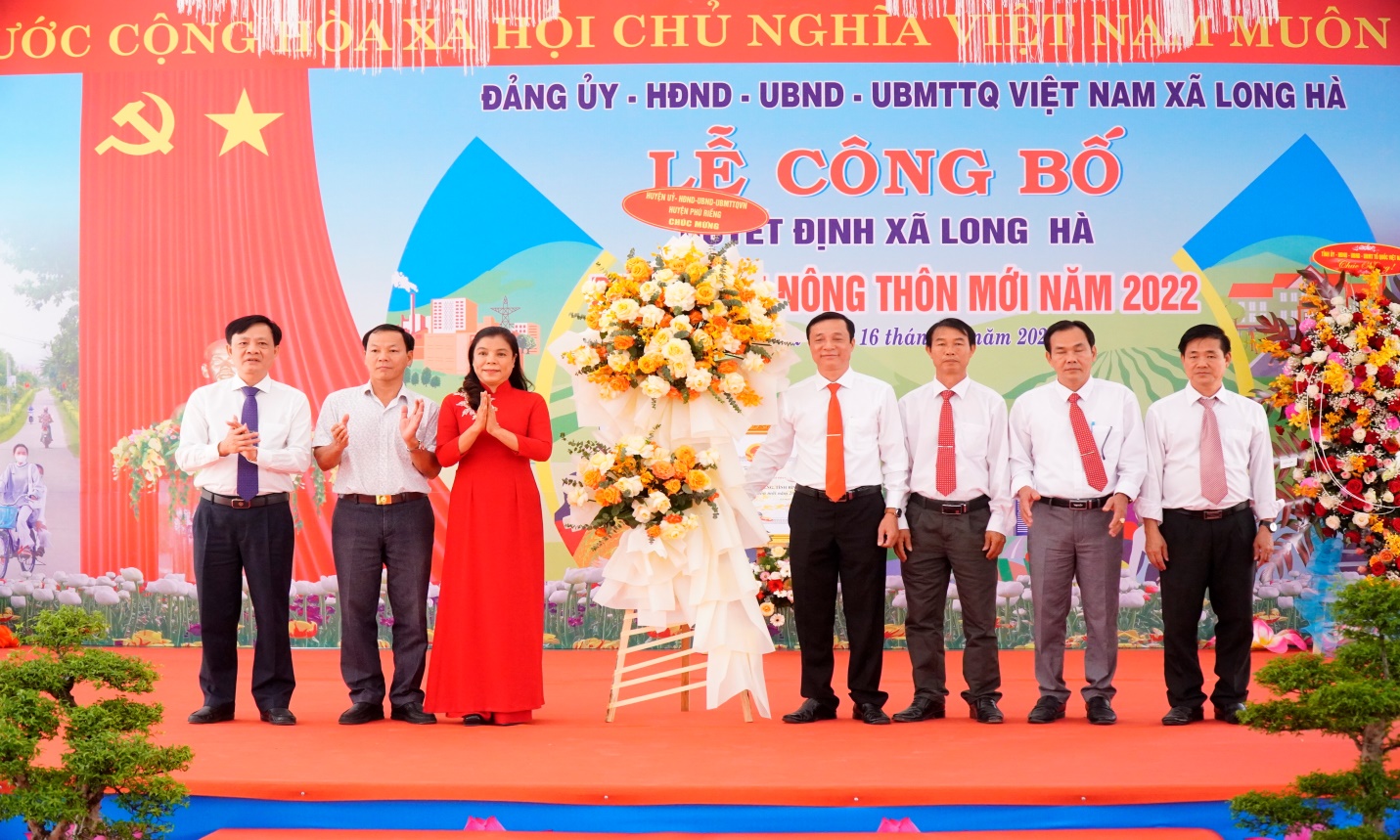 Sáng 16-1, huyện Phú Riềng phối hợp với Văn phòng điều phối nông thôn mới (NTM) của tỉnh tổ chức lễ công bố quyết định xã Long Hà đạt chuẩn NTM năm 2022. Dự lễ có Tỉnh ủy viên, Giám đốc, Tổng biên tập Đài Phát thanh Truyền hình và Báo Bình Phước (BPTV) Nguyễn Thị Minh Nhâm; lãnh đạo các sở, ban, ngành liên quan. Tỉnh ủy viên, Bí thư Huyện ủy Phú Riềng Nguyễn Thị Xuân Hòa; Phó Bí thư Huyện ủy, Chủ tịch UBND huyện Lê Anh Nam cùng dự. Thừa ủy quyền lãnh đạo tỉnh, Tỉnh ủy viên, Giám đốc, Tổng biên tập Đài Phát thanh Truyền hình và Báo Bình Phước (BPTV) Nguyễn Thị Minh Nhâm và Chủ tịch UBND huyện Lê Anh Nam trao bằng công nhận đạt chuẩn NTM cho xã Long HàLà xã có nhiều thôn đồng bào dân tộc thiểu số (DTTS), tỷ lệ đồng bào DTTS cao, kinh tế chủ yếu là nông nghiệp. Tuy nhiên vượt qua khó khăn những năm qua cả hệ thống chính trị và nhân dân trên địa bàn xã đồng lòng chung tay xây dựng NTM. Qua đó, địa phương đã hoàn thành 35 công trình với tổng mức đầu tư gần 53,635 tỷ đồng. Trong đó, người dân đóng góp khoảng 4 tỷ đồng vào xây dựng NTM. Đến nay xã đạt 19/19 tiêu chí và về đích NTM giúp thay đổi diện mạo của xã khang trang hơn. Hiện 100% các tuyến đường giao thông nông thôn được bê tông hóa theo cơ chế đặc thù, trên 33,30 km đường giao thông được thắp điện chiếu sáng, nhiều tuyến đừng hoa đã hình thành đảm bảo việc đi lại thuận tiện cho người dân. Bên cạnh đó, các trường học được đầu tư mới và nâng cấp đáp ứng nhu cầu dạy học đạt chuẩn 100%. Thiết chế văn hóa được chú trọng đầu tư xây dựng mới đảm bảo đời sống vật chất, tinh thần người dân ngày càng được nâng cao. Thu nhập bình quân đạt gần 62,9 triệu/đồng/người/năm; trên 91,1% người dân tham gia bảo hiểm y tế, đặc biệt số hộ nghèo giảm chỉ còn khoảng 0,31%. Tặng lẵng hoa của Tỉnh ủy - HĐND - UBND- ỦY ban MTTQ Vn tỉnh cho xã Long HàTỉnh ủy viên, Bí thư Huyện ủy Phú Riềng Nguyễn Thị Xuân Hòa; Phó Bí thư Huyện ủy, Chủ tịch UBND huyện Lê Anh Nam tặng lẵng hoa chúc mừng 1 tập thể và 2 cá nhân được Chủ tịch UBND tỉnh tặng bằng khen khen thưởng cho 4 tập thể và 7 cá nhân có thành tích tốt trong phong trào thi đua chung tay xây dựng NTMPhát biểu chỉ đạo tại lễ công bố, Phó Bí thư Huyện ủy, Chủ tịch UBND huyện Lê Anh Nam đề nghị: Đảng bộ, chính quyền và Nhân dân xã Long Hà cần tiếp tục đề cao trách nhiệm, nâng cao nhận thức của cả hệ thồng chính trị về xây dựng nông thôn mới; phải coi đây là nhiệm vụ chính trị trọng tâm, thường xuyên. Phải khẳng định vai trò chủ thể của người dân trong xây dựng nông thôn mới. Quyết tâm giữ vững và nâng cao chất lượng các tiêu chí; hướng tới phấn đấu xây dựng xã đạt chuẩn nông thôn mới nâng cao. Ban Chỉ đạo, Ban Quản lý nông thôn mới xã tiếp tục kiện toàn bộ máy tổ chức, nâng cao năng lực, trình độ của đội ngũ cán bộ làm công tác xây dựng nông thôn mới. Tập trung huy động lồng ghép các nguồn lực vào xây dựng nông thôn mới, phát huy thế mạnh của địa phương, đẩy mạnh công tác tuyên truyền, vận động mọi tầng lớp nhân dân chung tay, góp sức xây dựng nông thôn mới, xây dựng quê hương giàu, đẹp, văn minh. Chú trọng phát triển sản xuất, đẩy mạnh tái cơ cấu nông nghiệp gắn với phát triển dịch vụ, ngành nghề tiểu thủ công nghiệp; đẩy mạnh hợp tác, liên kết, ứng dụng tiến bộ khoa học công nghệ, gắn sản xuất với thị trường, nâng cao năng suất, chất lượng, hiệu quả và giá trị gia tăng trên sản phẩm nhằm mục tiêu tăng thu nhập của người dân. Dịp này, 1 tập thể và 2 cá nhân được Chủ tịch UBND tỉnh đã tặng bằng khen có thành tích xuất sắc trong phong trào thi đua toàn tỉnh chung sức xây dựng NTM giai đoạn 2021-2023. Và 4 tập thể, 7 cá nhân được Chủ tịch UBND huyện Phú Riềng khen thưởng vì có thành tích tốt trong phong trào thi đua toàn tỉnh chung tay xây dựng NTM trên địa bàn xã Long Hà, giai đoàn 2021-2025.